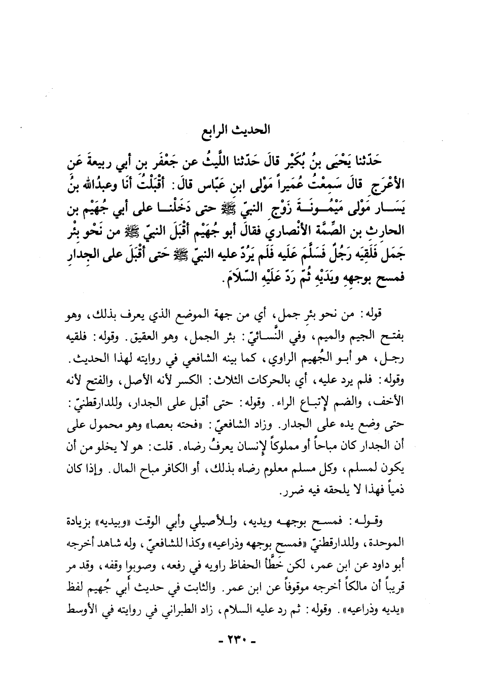 حَدَّثَنَا يَحْيَى بْنُ بُكَيْرٍ قَالَ حَدَّثَنَا اللَّيْثُ عَنْ جَعْفَرِ بْنِ رَبِيعَةَ عَنِ الأَعْرَجِ قَالَ سَمِعْتُ عُمَيْرًا مَوْلَى ابْنِ عَبَّاسٍ قَالَ: أَقْبَلْتُ أَنَا وَعَبْدُ اللَّهِ بْنُ يَسَارٍ مَوْلَى مَيْمُونَةَ زَوْجِ النَّبِيِّ -صلى الله عليه وسلم- حَتَّى دَخَلْنَا عَلَى أَبِي جُهَيْمِ بْنِ الْحَارِثِ بْنِ الصِّمَّةِ الأَنْصَارِيِّ فَقَالَ أَبُو الْجُهَيْمِ أَقْبَلَ النَّبِيُّ -صلى الله عليه وسلم- مِنْ نَحْوِ بِئْرِ جَمَلٍ، فَلَقِيَهُ رَجُلٌ فَسَلَّمَ عَلَيْهِ، فَلَمْ يَرُدَّ عَلَيْهِ النَّبِيُّ -صلى الله عليه وسلم- حَتَّى أَقْبَلَ عَلَى الْجِدَارِ، فَمَسَحَ بِوَجْهِهِ وَيَدَيْهِ، ثُمَّ رَدَّ عَلَيْهِ السَّلاَمَ.