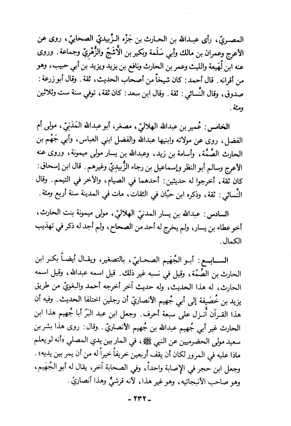 السابع: أبو الجُهَيم الصحابيّ، بالتصغير، ويقال أيضًا بكر ابن الحارث بن الصِّمّة، وقيل في نسبه غير ذلك. قيل اسمه عبد الله، وقيل اسمه الحارث، له هذا الحديث، وله حديث آخر أخرجه أحمد والبغويّ من طريق يزيد بن خُصَيفة إلى أبي جُهيم الأنصاريّ أن رجلين اختلفا الحديث. وفيه أن هذا القرآن أُنزل على سبعة أحرف. وجعل ابن عبد البَرّ أبا جُهيم هذا ابن الحارث غير أبي جُهيم عبد الله بن جُهيم الأنصاريّ .. وقال: روى هذا بشر بن سعيد مولى الحضرميين عن النبي -صلى الله عليه وسلم-، في المار بين يدي المصلي "أنه لو يعلم ماذا عليه في المرور لكان أن يقف أربعين خريفًا خيرًا له من أن يمر بين يديه". وجعل ابن حجر في الإِصابة واحدًا، وفي الصحابة آخر، يقال له أبو الجُهَيم، وهو صاحب الأنبجاتيه، وهو غير هذا؛ لأنه قرشيٌّ وهذا أنصاريّ.