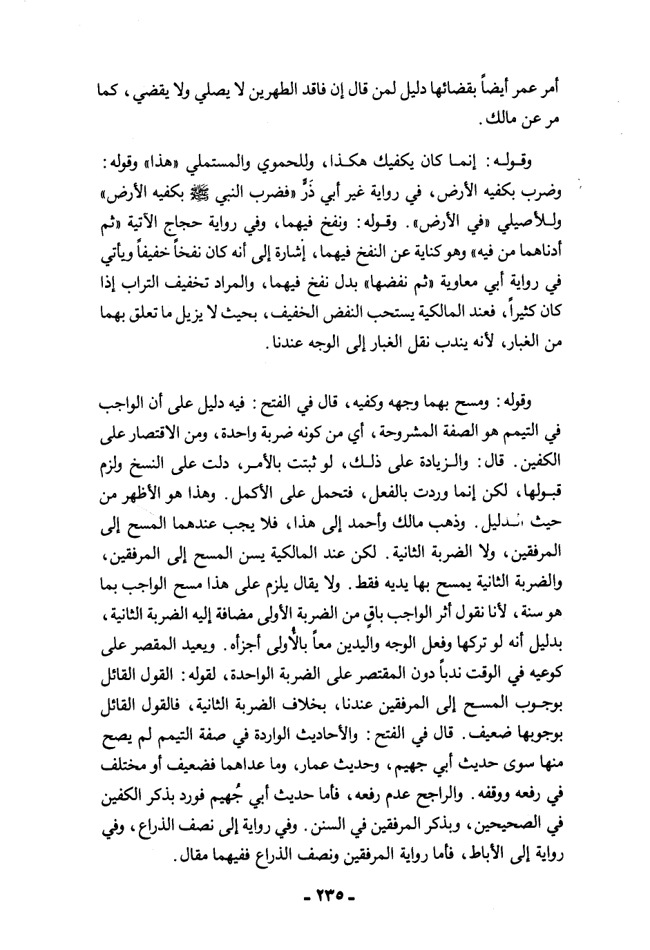 وقوله: ومسح بهما وجهه وكفيه، قال في الفتح: فيه دليل على أن الواجب في التيمم هو الصفة المشروحة، أي من كونه ضربة واحدة، ومن الاقتصار على الكفين. قال: والزيادة على ذلك، لو ثبتت بالأمر، دلت على النسخ ولزم قبولها، لكن إنما وردت بالفعل، فتحمل على الأكمل. وهذا هو الأظهر من حيث الدليل. وذهب مالك وأحمد إلى هذا، فلا يجب عندهما المسح إلى المرفقين، ولا الضربة الثانية. لكن عند المالكية يسن المسح إلى المرفقين، والضربة الثانية يمسح بها يديه فقط. ولا يقال يلزم على هذا مسح الواجب بما هو سنة؛ لأنا نقول أثر الواجب باقٍ من الضربة الأولى مضافة إليه الضربة الثانية، بدليل أنه لو تركها وفعل الوجه واليدين معًا بالأُولى أجزأه. ويعيد المقصر على كوعيه في الوقت ندبًا دون المقتصر على الضربة الواحدة، لقوله: القول القائل بوجوب المسح إلى المرفقين عندنا، بخلاف الضربة الثانية، فالقول القائل بوجوبها ضعيف. قال في الفتح: والأحاديث الواردة في صفة التيمم لم يصح منها سوى حديث أبي جهيم، وحديث عمار، وما عداهما فضعيف أو مختلف في رفعه ووقفه. والراجح عدم رفعه، فأما حديث أبي جُهيم فورد بذكر الكفين في الصحيحين، وبذكر المرفقين في السنن. وفي رواية إلى نصف الذراع، وفي رواية إلى الأباط، فأما رواية المرفقين ونصف الذراع ففيهما مقال.