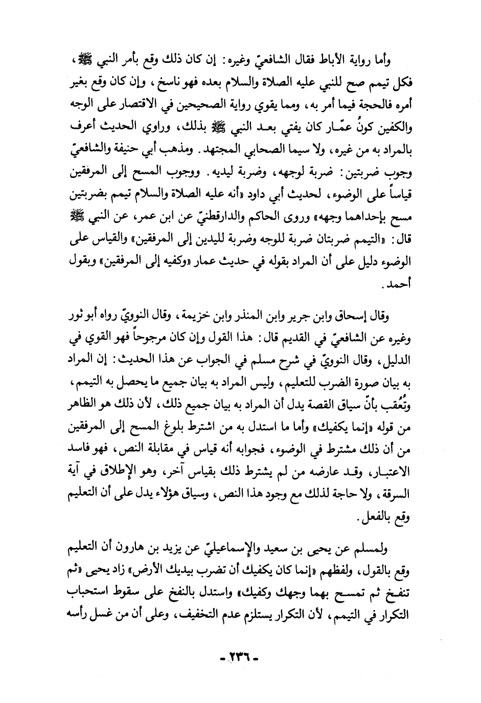 وقال إسحاق وابن جرير وابن المنذر وابن خزيمة، وقال النوويّ رواه أبو ثور وغيره عن الشافعيّ في القديم قال: هذا القول وإن كان مرجوحًا فهو القوي في الدليل، وقال النوويّ في شرح مسلم في الجواب عن هذا الحديث: إن المراد به بيان صورة الضرب للتعليم، وليس المراد به بيان جميع ما يحصل به التيمم، وتُعُقب بأنّ سياق القصة يدل أن المراد به بيان جميع ذلك؛ لأن ذلك هو الظاهر من قوله "إنما يكفيك" وأما ما استدل به من اشترط بلوغ المسح إلى المرفقين من أن ذلك مشترط في الوضوء، فجوابه أنه قياس في مقابلة النص، فهو فاسد الاعتبار، وقد عارضه من لم يشترط ذلك بقياس آخر، وهو الإطلاق في آية السرقة، ولا حاجة لذلك مع وجود هذا النص، وسياق هؤلاء يدل على أن التعليم وقع بالفعل.
