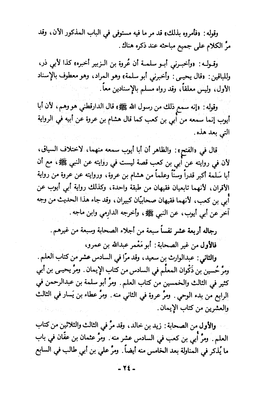 والثاني: عبد الوارث بن سعيد، وقد مرّا في السادس عشر من كتاب العلم. ومرَّ حُسين بن ذَكْوان المعلِّم في السادس من كتاب الإيمان. ومرَّ يحيى بن أبي كثير في الثالث والخمسين من كتاب العلم. ومرَّ أبو سلمة بن عبد الرحمن في الرابع من بدء الوحي. ومرَّ عروة في الثاني منه. ومرَّ عطاء بن يَسار في الثالث والعشرين من كتاب الإيمان.