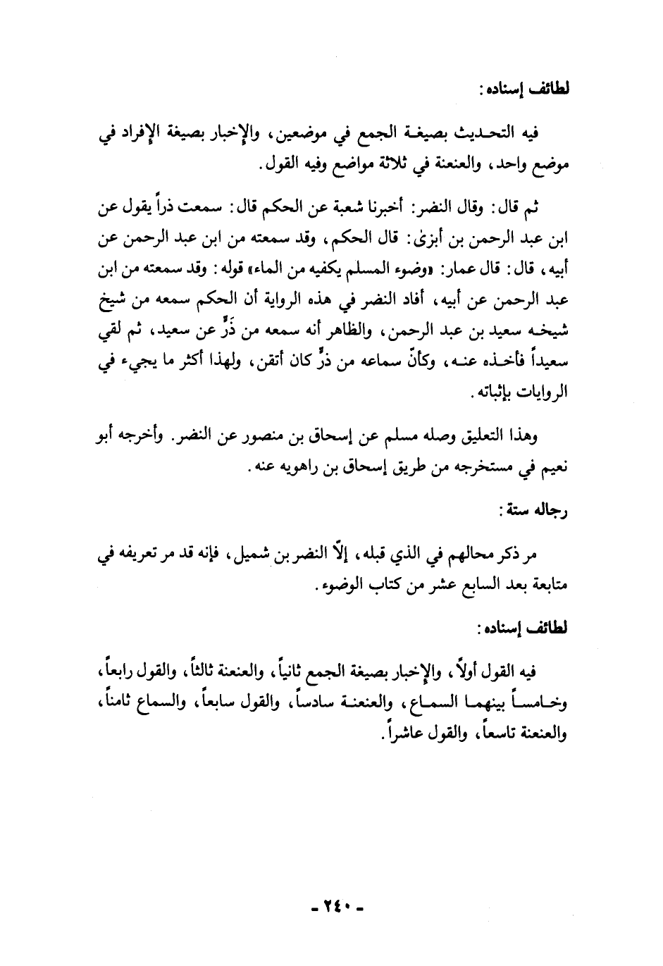 ثم قال: وقال النضر: أخبرنا شعبة عن الحكم قال: سمعت ذرًا يقول عن ابن عبد الرحمن بن أبزى: قال الحكم، وقد سمعته من ابن عبد الرحمن عن أبيه، قال: قال عمار: "وضوء المسلم يكفيه من الماء" قوله: وقد سمعته من ابن عبد الرحمن عن أبيه، أفاد النضر في هذه الرواية أن الحكم سمعه من شيخ شيخه سعيد بن عبد الرحمن، والظاهر أنه سمعه من ذَرٍّ عن سعيد، ثم لقي سعيدًا فأخذه عنه، وكأنّ سماعه من ذرٍّ كان أتقن، ولهذا أكثر ما يجيء في الروايات بإثباته.