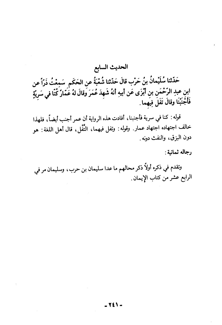 حَدَّثَنَا سُلَيْمَانُ بْنُ حَرْبٍ قَالَ حَدَّثَنَا شُعْبَةُ عَنِ الْحَكَمِ سَمِعْتُ ذَرًّا عَنِ ابْنِ عَبْدِ الرَّحْمَنِ بْنِ أَبْزَى عَنْ أَبِيهِ أَنَّهُ شَهِدَ عُمَرَ وَقَالَ لَهُ عَمَّارٌ كُنَّا فِي سَرِيَّةٍ فَأَجْنَبْنَا، وَقَالَ تَفَلَ فِيهِمَا.