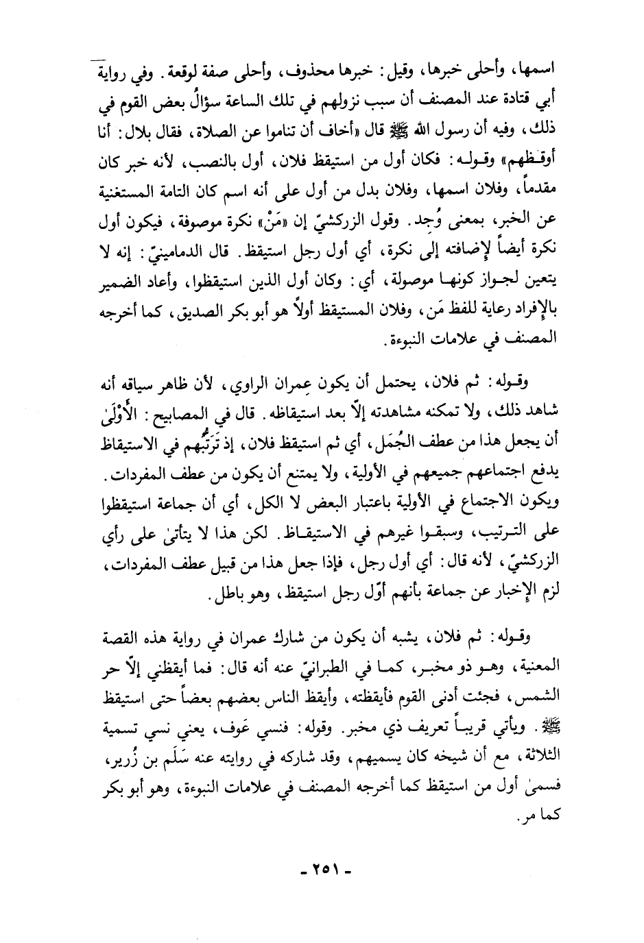 وقوله: ثم فلان، يحتمل أن يكون عِمران الراوي؛ لأن ظاهر سياقه أنه شاهد ذلك، ولا تمكنه مشاهدته إلاّ بعد استيقاظه. قال في المصابيح: الأَوْلَى أن يجعل هذا من عطف الجُمَل، أي ثم استيقظ فلان، إذ تَرَتُّبُهم في الاستيقاظ يدفع اجتماعهم جميعهم في الأولية، ولا يمتنع أن يكون من عطف المفردات. ويكون الاجتماع في الأولية باعتبار البعض لا الكل، أي أن جماعة استيقظوا على الترتيب، وسبقوا غيرهم في الاستيقاظ. لكن هذا لا يتأتى على رأي الزركشيّ؛ لأنه قال: أي أول رجل، فإذا جعل هذا من قبيل عطف المفردات، لزم الإِخبار عن جماعة بأنهم أوّل رجل استيقظ، وهو باطل.