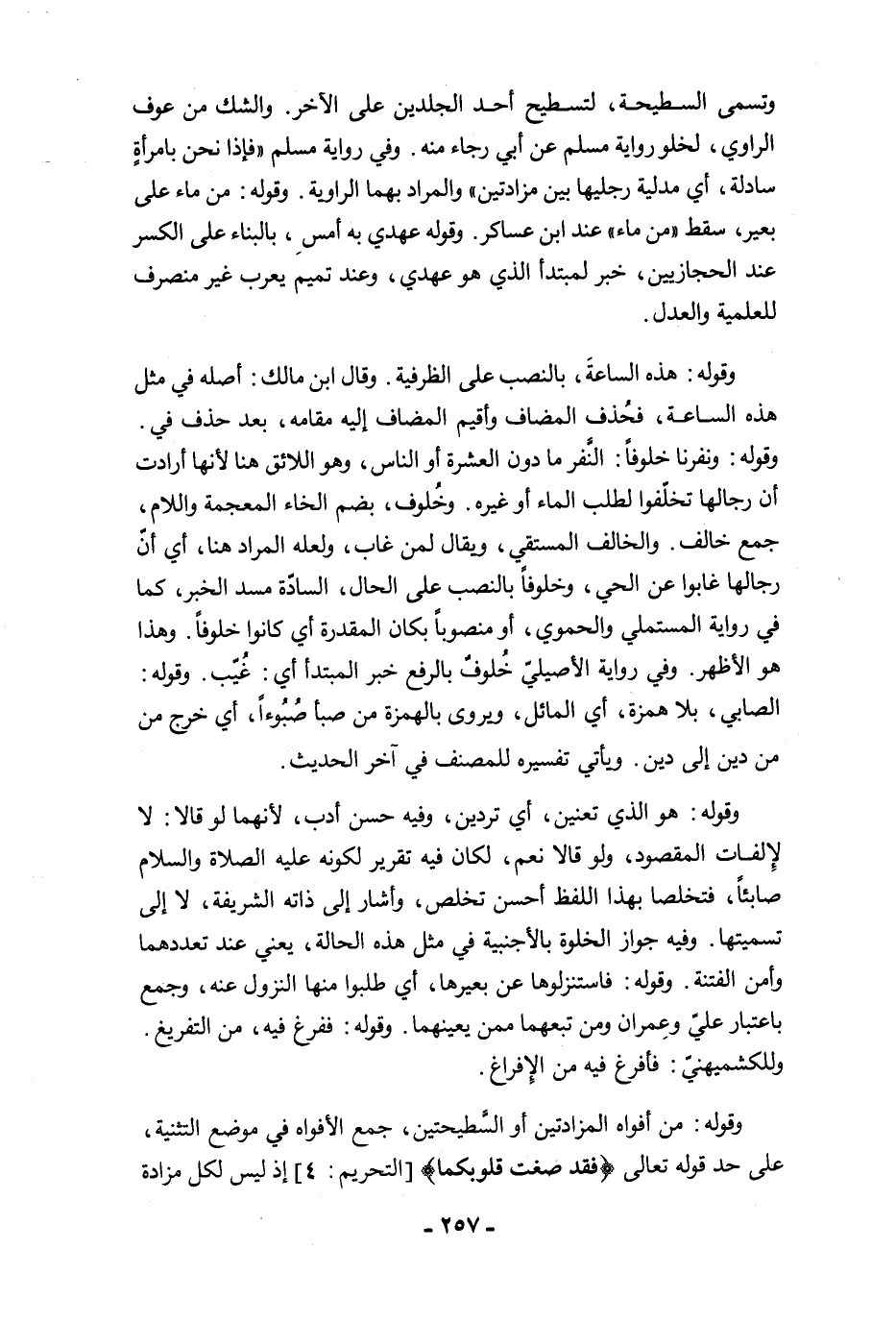 وقوله: هذه الساعةَ، بالنصب على الظرفية. وقال ابن مالك: أصله في مثل هذه الساعة، فحُذف المضاف وأقيم المضاف إليه مقامه، بعد حذف في. وقوله: ونفرنا خلوفًا: النفر ما دون العشرة أو الناس، وهو اللائق هنا لأنها أرادت أن رجالها تخلّفوا لطلب الماء أوغيره. وخُلوف، بضم الخاء المعجمة واللام، جمع خالف. والخالف المستقي، ويقال لمن غاب، ولعله المراد هنا، أي أنّ رجالها غابوا عن الحي، وخلوفًا بالنصب على الحال، السادّة مسد الخبر، كما في رواية المستملي والحموي، أو منصوبًا بكان المقدرة أي كانوا خلوفًا. وهذا هو الأظهر. وفي رواية الأصيلىّ خُلوفٌ بالرفع خبر المبتدأ أي: غُيب. وقوله: الصابي، بلا همزة، أي الماثل، ويروى بالهمزة من صبأ صُبُوءًا، أي خرج من من دين إلى دين. ويأتي تفسيره للمصنف في آخر الحديث.