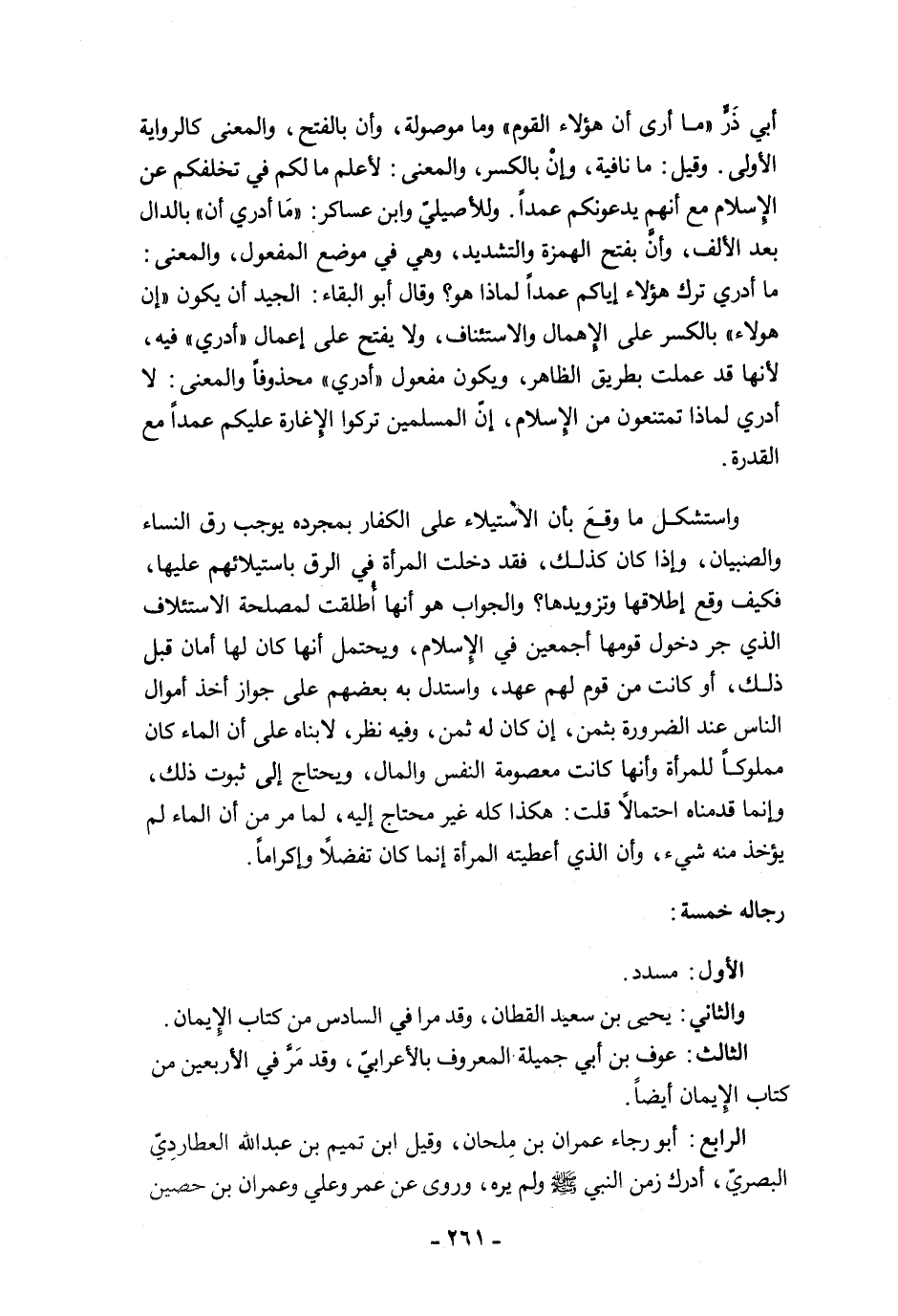أبي ذَرٍّ "ما أرى أن هؤلاء القوم" وما موصولة، وأن بالفتح، والمعنى كالرواية الأولى. وقيل: ما نافية، وإنْ بالكسر، والمعنى: لأعلم ما لكم في تخلفكم عن الإِسلام مع أنهم يدعونكم عمدًا. وللأصيليّ وابن عساكر: "مَا أدري أن" بالدال بعد الألف، وأنَّ بفتح الهمزة والتشديد، وهي في موضع المفعول، والمعنى: ما أدري ترك هؤلاء إياكم عمدًا لماذا هو؟ وقال أبو البقاء: الجيد أن يكون "إن هؤلاء" بالكسر على الإهمال والاستئناف، ولا يفتح على إعمال "أدري" فيه، لأنها قد عملت بطريق الظاهر، ويكون مفعول "أدري" محذوفًا والمعنى: لا أدري لماذا تمتنعون من الإِسلام، إن المسلمين تركوا الإغارة عليكم عمدًا مع القدرة.