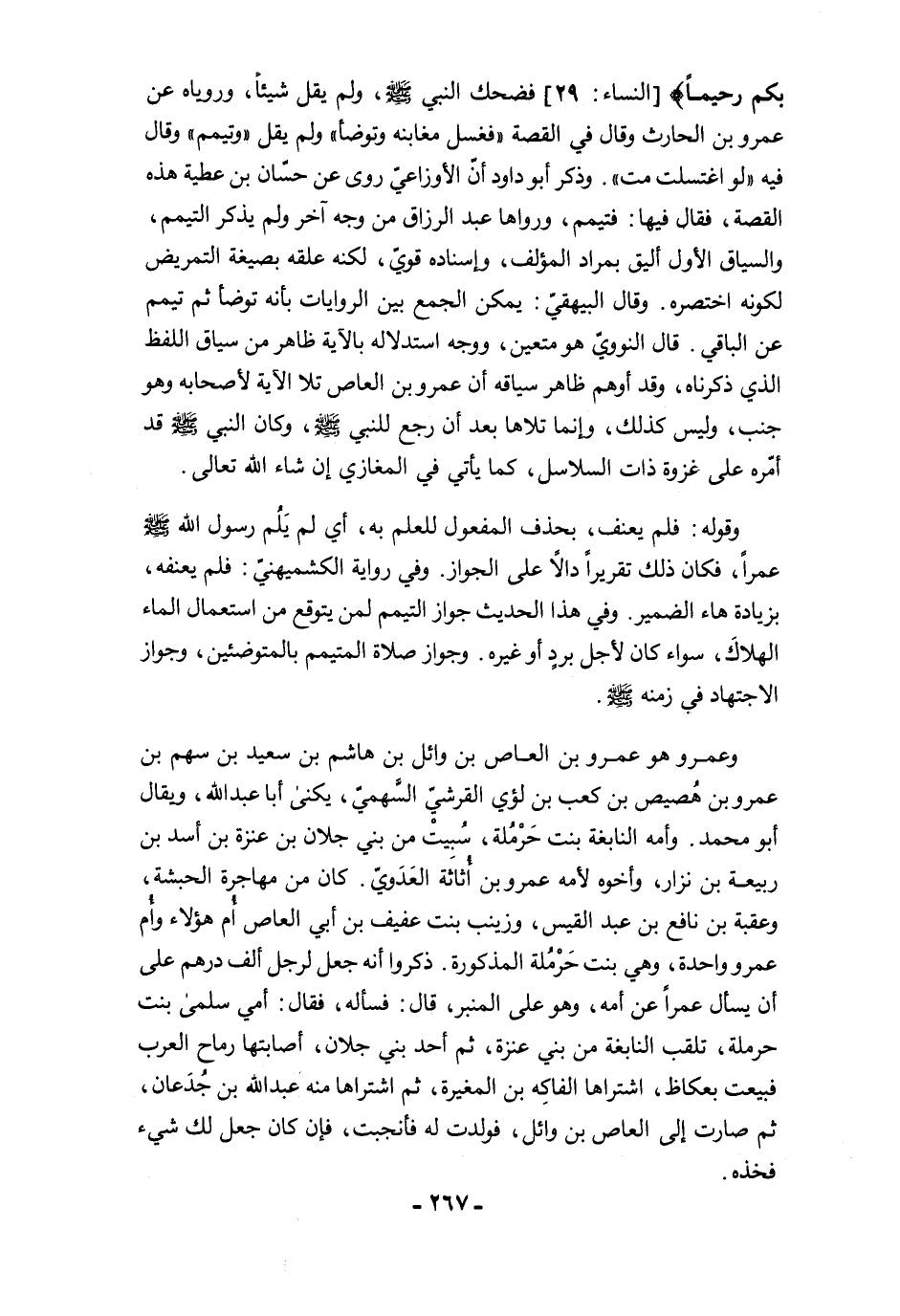 بِكُمْ رَحِيمًا} [النساء: 29] فضحك النبي -صلى الله عليه وسلم-، ولم يقل شيئاً، وروياه عن عمرو بن الحارث وقال في القصة "فغسل مغابنه وتوضأ" ولم يقل "وتيمم" وقال فيه "لو اغتسلت مت". وذكر أبو داود أنّ الأوزاعيّ روى عن حسّان بن عطية هذه القصة، فقال فيها: فتيمم، ورواها عبد الرزاق من وجه آخر ولم يذكر التيمم، والسياق الأول أليق بمراد المؤلف، وإسناده قويّ، لكنه علقه بصيغة التمريض لكونه اختصره. وقال البيهقيّ: يمكن الجمع بين الروايات بأنه توضأ ثم تيمم عن الباقي. قال النوويّ هو متعين، ووجه استدلاله بالآية ظاهر من سياق اللفظ الذي ذكرناه، وقد أوهم ظاهر سياقه أن عمرو بن العاص تلا الآية لأصحابه وهو جنب، وليس كذلك، وإنما تلاها بعد أن رجع للنبي -صلى الله عليه وسلم-، وكان النبي -صلى الله عليه وسلم- قد أمّره على غزوة ذات السلاسل، كما يأتي في المغازي إن شاء الله تعالى.