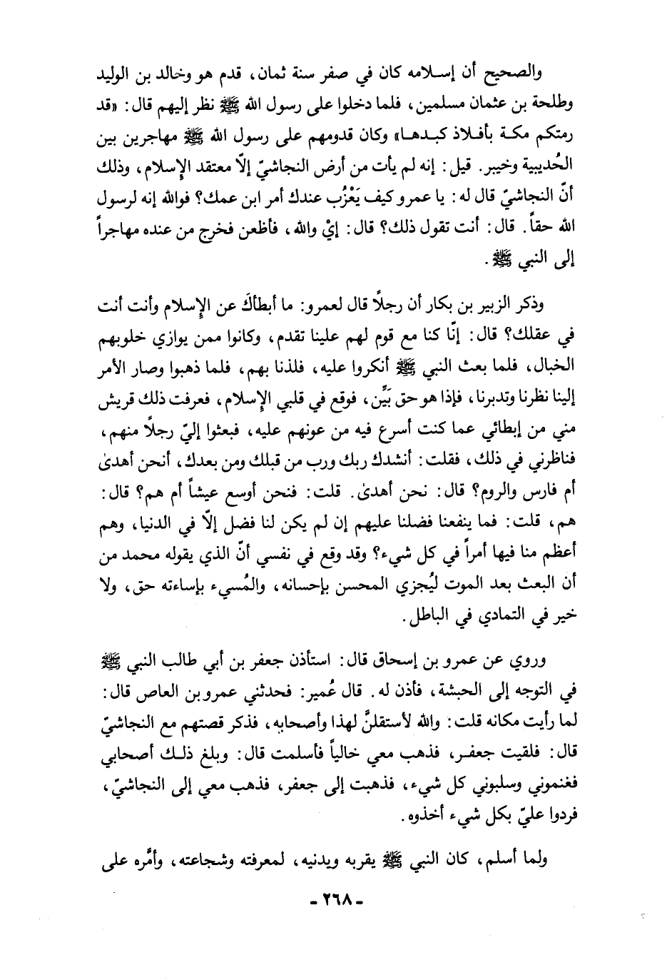 وروي عن عمرو بن إسحاق قال: استأذن جعفر بن أبي طالب النبي -صلى الله عليه وسلم-. في التوجه إلى الحبشة، فأذن له. قال عُمير: فحدثني عمرو بن العاص قال: لما رأيت مكانه قلت: والله لأستقلنَّ لهذا وأصحابه، فذكر قصتهم مع النجاشيّ قال: فلقيت جعفر، فذهب معي خاليًا فاسلمت قال: وبلغ ذلك أصحابي فغنموني وسلبوني كل شيء، فذهبت إلى جعفر، فذهب معي إلى النجاشيّ، فردوا عليّ بكل شيء أخذوه.