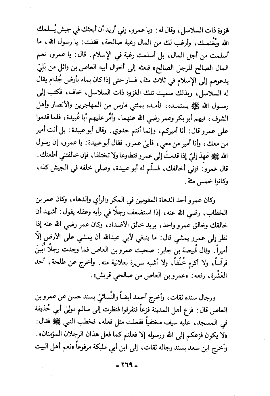 غزوة ذات السلاسل، وقال له: "يا عمرو، إني أريد أن أبعثك في جيش يُسلمك الله ويُغْنمك، وأرغب لك من المال رغبة صالحة، فقلت: يا رسول الله، ما أسلمت من أجل المال، بل أسلمت رغبة في الإِسلام. قال: يا عمرو، نعم المال الصالح للرجل الصالح" فبعثه إلى أخوال أبيه العاص بن وائل من بَلِيّ يدعوهم إلى الإِسلام في ثلاث مئة، فسار حتى إذا كان بماء بأرض جُذام يقال له السلاسل، وبذلك سميت تلك الغزوة ذات السلاسل، خاف، فكتب إلى رسول الله -صلى الله عليه وسلم- يستمده، فأمده بمئتي فارس من المهاجرين والأنصار وأهل الشرف، فيهم أبو بكر وعمر رضي الله عنهما، وأمَّر عليهم أبا عُبيدة، فلما قدموا على عمرو قال: أنا أميركم، وإنما أنتم حدوي. وقال أبو عبيدة: بل أنت أمير من معك، وأنا أمير من معي، فأبى عمرو، فقال أبو عبيدة: يا عمرو، إن رسول الله -صلى الله عليه وسلم- عَهِدَ إليّ إذا قدمتَ إلى عمرو فتطاوعا ولا تختلفا، فإن خالفتني أطعتك. قال عمرو: فإني أخالفك، فسلّم له أبو عبيدة، وصلى خلفه في الجيش كله، وكانوا خمس مئة.