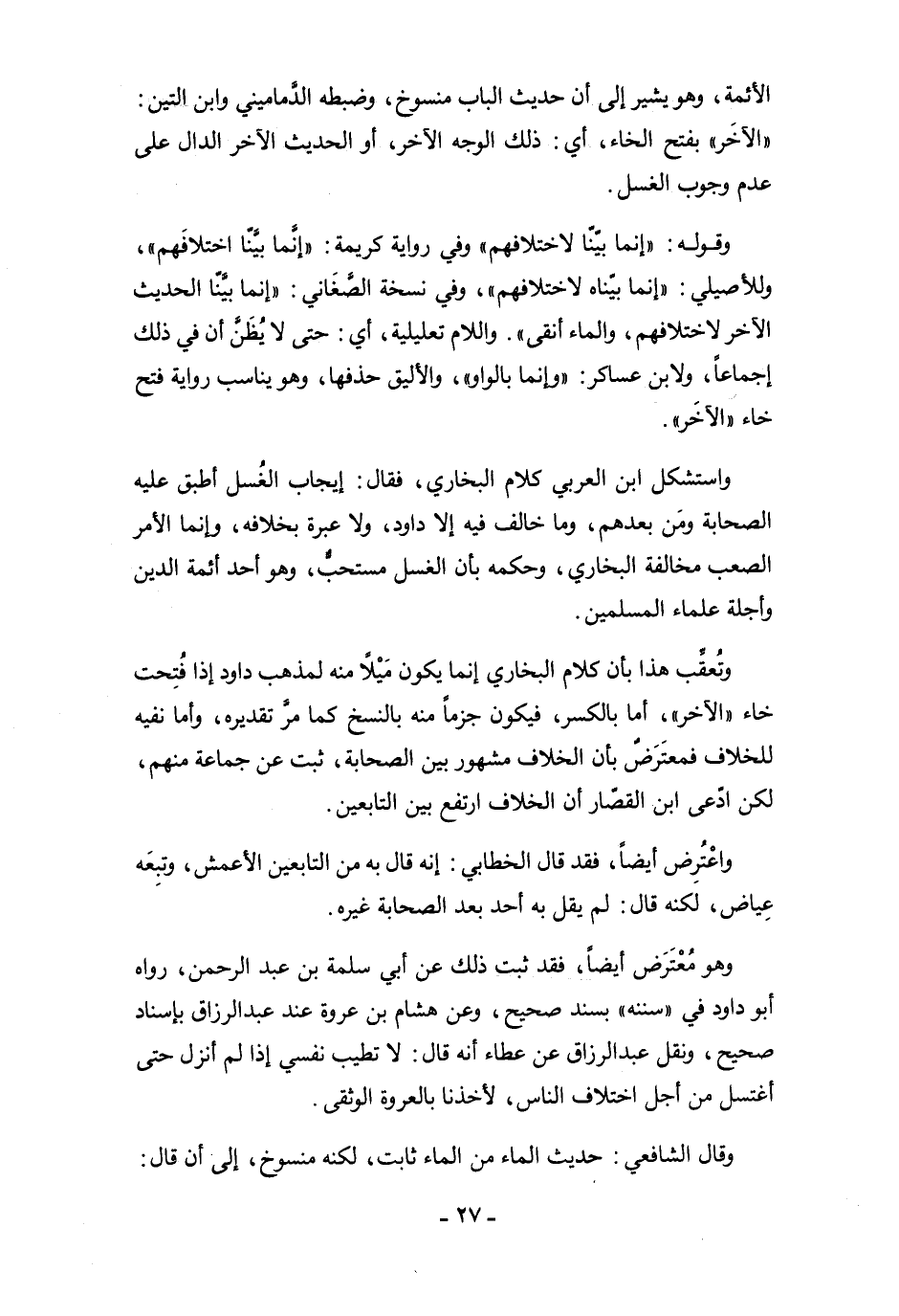 الأئمة، وهو يشير إلى أن حديث الباب منسوخ، وضبطه الدَّماميني وابن التين: "الآخَر" بفتح الخاء، أي: ذلك الوجه الآخر، أو الحديث الآخر الدال على عدم وجوب الغسل.