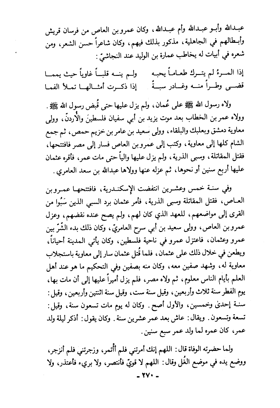 عبد الله وأبو عبد الله وأم عبد الله، وكان عمرو بن العاص من فرسان قريش وأبطالهم في الجاهلية، مذكور بذلك فيهم، وكان شاعرًا حسن الشعر، ومن شعره في أبيات له يخاطب عمارة بن الوليد عند النجاشيّ:
