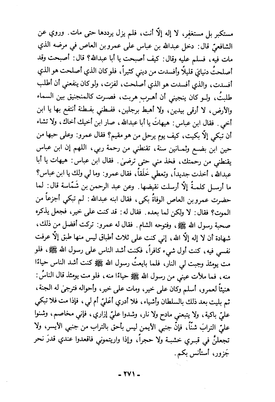 مستكبر بل مستغفِر، لا إله إلَّا أنت، فلم يزل يرددها حتى مات. وروي عن الشافعيّ قال: دخل عبد الله بن عباس على عمرو بن العاص في مرضه الذي مات فيه، فسلم عليه وقال: كيف أصبحت يا أبا عبد الله؟ قال: أصبحت وقد أصلحتُ دنيايَ قليلًا وأفسدت من ديني كثيرًا، فلو كان الذي أصلحت هو الذي أفسدت، والذي أفسدت هو الذي أصلحت، لفزت، ولو كان ينفعني أن أطلب طلبتُ، ولو كان ينجيني أن أهرب هربت، فصرت كالمنجنيق بين السماء والأرض، لا أرقى بيدين، ولا أهبط برجلين، ففطني بفطنة أنتفع بها يا ابن أخي. فقال ابن عباس: هيهاتَ يا أبا عبد الله، صار ابن أخيك أخاك، ولا تشاء أن تبكي إلَّا بكيت، كيف يوم يرحل من هو مقيم؟ فقال عمرو: وعلى حبها من حين ابن بضع وثمانين سنة، تقنطني من رحمة ربي، اللهم إن ابن عباس يقنطني من رحمتك، فخذ مني حتى ترضى. فقال ابن عباس: هيهات يا أبا عبد الله، أخذت جديدًا، وتعطي خَلَقًا، فقال عمرو: وما لي ولك يا ابن عباس؟ ما أرسل كلمةً إلا أرسلت نقيضها. وعن عبد الرحمن بن شَمّاسة قال: لما حضرت عمرو بن العاص الوفاةُ بكى، فقال ابنه عبد الله: لم تبكي أجزعًا من الموت؟ فقال: لا ولكن لما بعده. فقال له: قد كنت على خير، فجعل يذكره صحبة رسول الله -صلى الله عليه وسلم-، وفتوحه الشام. فقال له عمرو: تركت أفضل من ذلك، شهادة أن لا إله إلا الله، إني كنت على ثلاث أطباق ليس منها طبق إلَّا عرفت نفسي فيه، كنت أول شيء كافرًا، فكنت أشد الناس على رسول الله -صلى الله عليه وسلم-، فلو مت يومئذ وجبت لي النار، فلما بايعتُ رسول الله -صلى الله عليه وسلم-كنت أشد الناس حياءًا منه، فما ملأت عيني من رسول الله -صلى الله عليه وسلم- حياءًا منه، فلو مت يومئذ قال الناسُ: هنيئًا لعمرو، أسلم وكان على خير، ومات على خير، وأحواله فترجى له الجنة، ثم بليت بعد ذلك بالسلطان وأشياء، فلا أدري أعَليّ أم لي، فإذا مت فلا تبكي عليّ باكية، ولا يتبعني مادح ولا نار، وشدوا عليّ إزاري، فإني مخاصم، وشنوا عليّ الترابَ شنًّا، فإن جنبي الأيمن ليس باحق بالتراب من جنبي الأيسر، ولا تجعلن في قبري خشبة ولا حجرًا، وإذا واريتموني فاقعدوا عندي قدرَ نحر جَزور، أستأنس بكم.