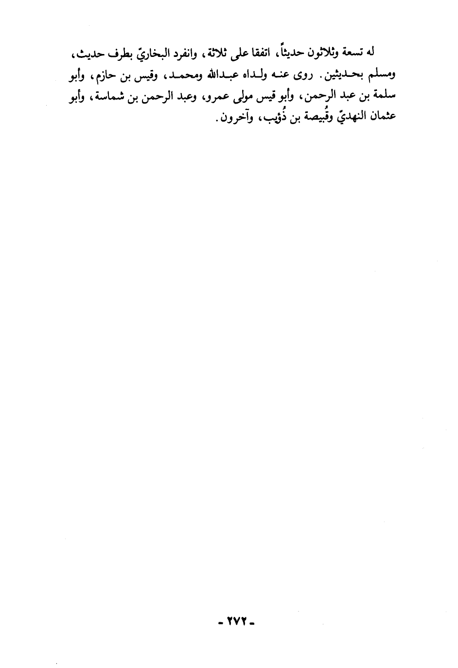 له تسعة وثلاثون حديثًا، اتفقا على ثلاثة، وانفرد البخاري بطرف حديث، ومسلم بحديثين. روى عنه ولداه عبد الله ومحمد، وقيس بن حازم، وأبو سلمة بن عبد الرحمن، وأبو قيس مولى عمرو، وعبد الرحمن بن شماسة، وأبو عثمان النهديّ وقُبيصة بن ذُؤيب، وآخرون.