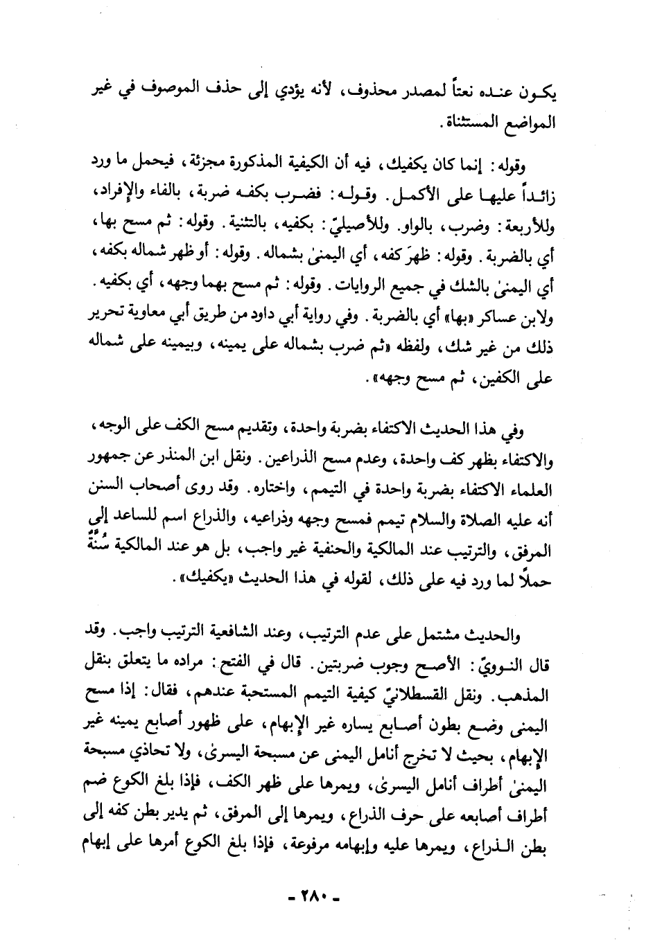 والحديث مشتمل على عدم الترتيب، وعند الشافعية الترتيب واجب. وقد قال النوويّ: الأصح وجوب ضربتين. قال في الفتح: مراده ما يتعلق بنقل المذهب. ونقل القسطلانيّ كيفية التيمم المستحبة عندهم، فقال: إذا مسح اليمنى وضع بطون أصابع يساره غير الإبهام، على ظهور أصابع يمينه غير الإبهام، بحيث لا تخرج أنامل اليمنى عن مسبحة اليسرى، ولا تحاذي مسبحة اليمنى أطراف أنامل اليسرى، ويمرها على ظهر الكف، فإذا بلغ الكوع ضم أطراف أصابعه على حرف الذراع، ويمرها إلى المرفق، ثم يدير بطن كفه إلى بطن الذراع، ويمرها عليه وإبهامه مرفوعة، فإذا بلغ الكوع أمرها على إبهام
