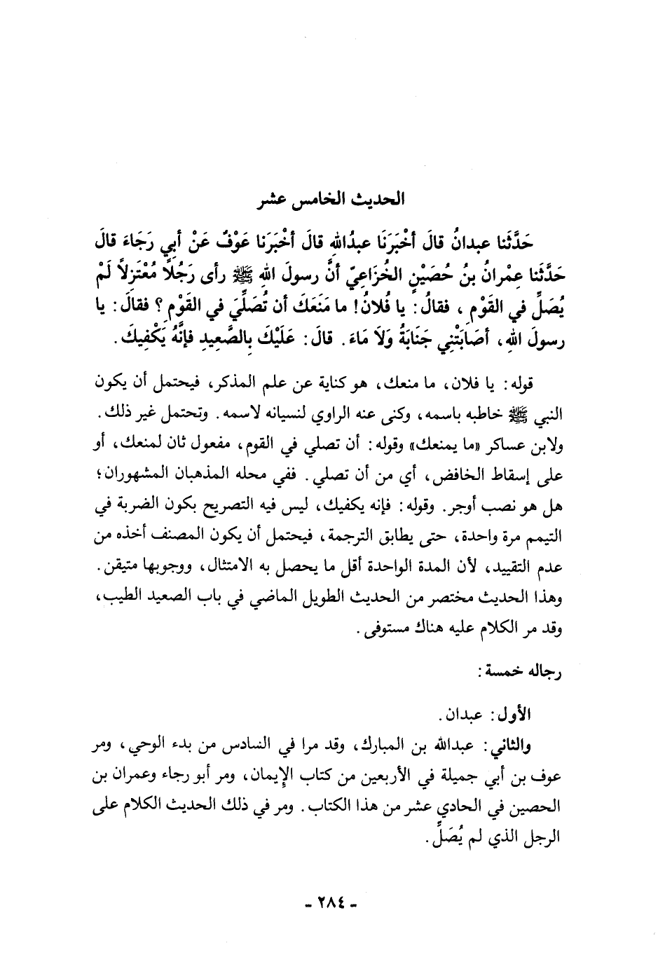 حَدَّثَنَا عَبْدَانُ قَالَ أَخْبَرَنَا عَبْدُ اللَّهِ قَالَ أَخْبَرَنَا عَوْفٌ عَنْ أَبِي رَجَاءٍ قَالَ حَدَّثَنَا عِمْرَانُ بْنُ حُصَيْنٍ الْخُزَاعِيُّ أَنَّ رَسُولَ اللَّهِ -صلى الله عليه وسلم- رَأَى رَجُلاً مُعْتَزِلاً لَمْ يُصَلِّ فِي الْقَوْمِ، فَقَالَ: "يَا فُلاَنُ! مَا مَنَعَكَ أَنْ تُصَلِّيَ فِي الْقَوْمِ؟. فَقَالَ: يَا رَسُولَ اللَّهِ، أَصَابَتْنِي جَنَابَةٌ وَلاَ مَاءَ. قَالَ: "عَلَيْكَ بِالصَّعِيدِ فَإِنَّهُ يَكْفِيكَ".