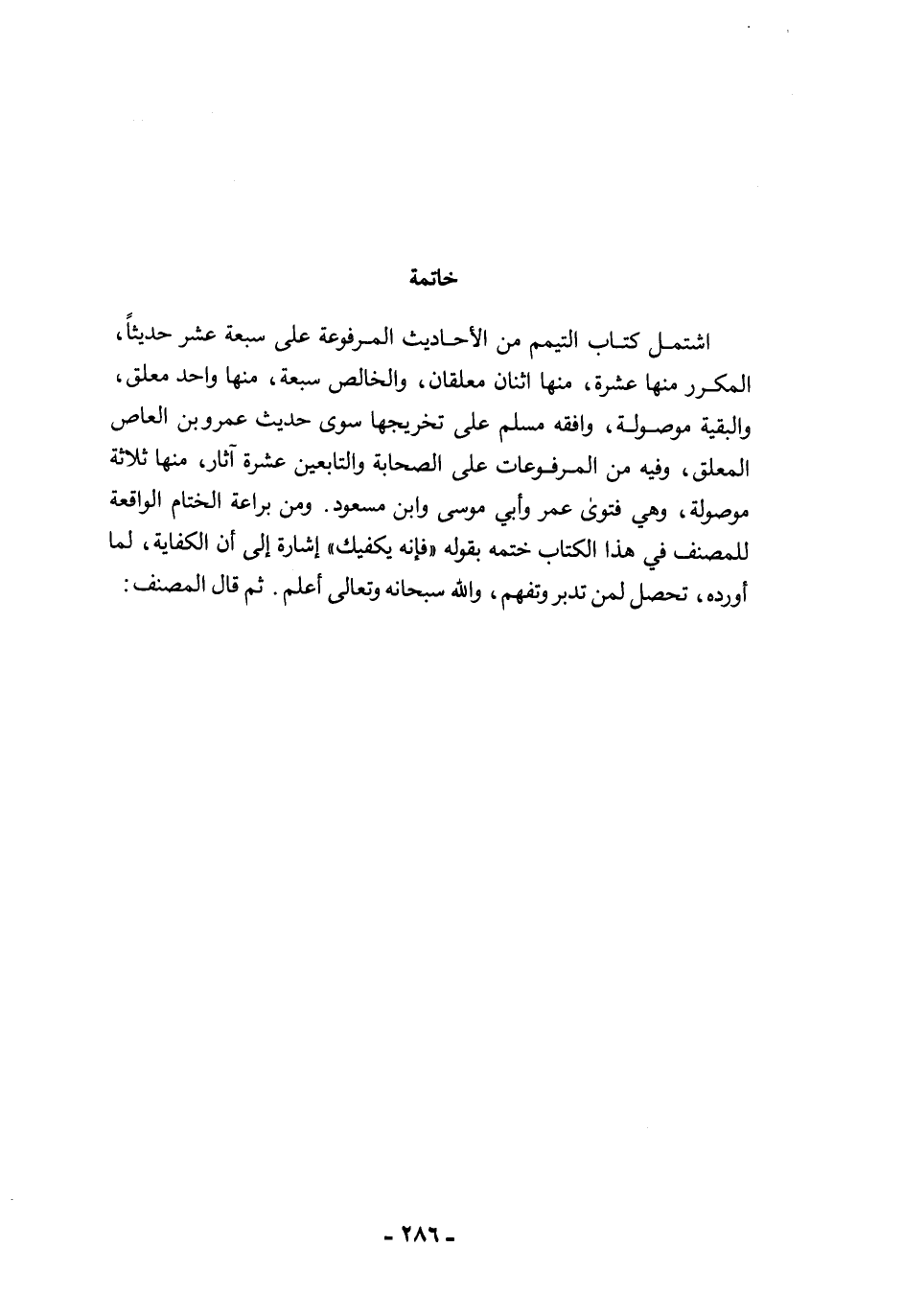 اشتمل كتاب التيمم من الأحاديث المرفوعة على سبعة عشر حديثًا، المكرر منها عشرة، منها اثنان معلقان، والخالص سبعة، منها واحد معلق، والبقية موصولة، وافقه مسلم على تخريجها سوى حديث عمرو بن العاص المعلق، وفيه من المرفوعات على الصحابة والتابعين عشرة آثار، منها ثلاثة موصولة، وهي فتوى عمر وأبي موسى وابن مسعود. ومن براعة الختام الواقعة للمصنف في هذا الكتاب ختمه بقوله "فإنه يكفيك" إشارة إلى أن الكفاية، لما أورده، تحصل لمن تدبر وتفهم، والله سبحانه وتعالى أعلم. ثم قال المصنف: