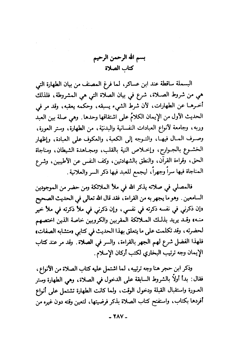 البسملة ساقطة عند ابن عساكر، لما فرغ المصنف من بيان الطهارة التي هي من شروط الصلاة، شرع في بيان الصلاة التي هي المشروطة، فلذلك أخرها عن الطهارات؛ لأن شرط الشيء يسبقه، وحكمه يعقبه، وقد مرَّ في الحديث الأول من الإيمان الكلامُ على اشتقاقها وحدها. وهي صلة بين العبد وربه، وجامعة لأنواع العبادات النفسانية والبدنية، من الطهارة، وستر العورة، وصرف المال فيها، والتوجه إلى الكعبة، والعكوف على العبادة، وإظهار الخشوع بالجوارح، وإخلاص النية بالقلب، ومجاهدة الشيطان، ومناجاة الحق، وقراءة القرآن، والنطق بالشهادتين، وكف النفس عن الأطيبين، وشرع المناجاة فيها سرًا وجهرًا، ليجمع للعبد فيها ذكر السر والعلانية.