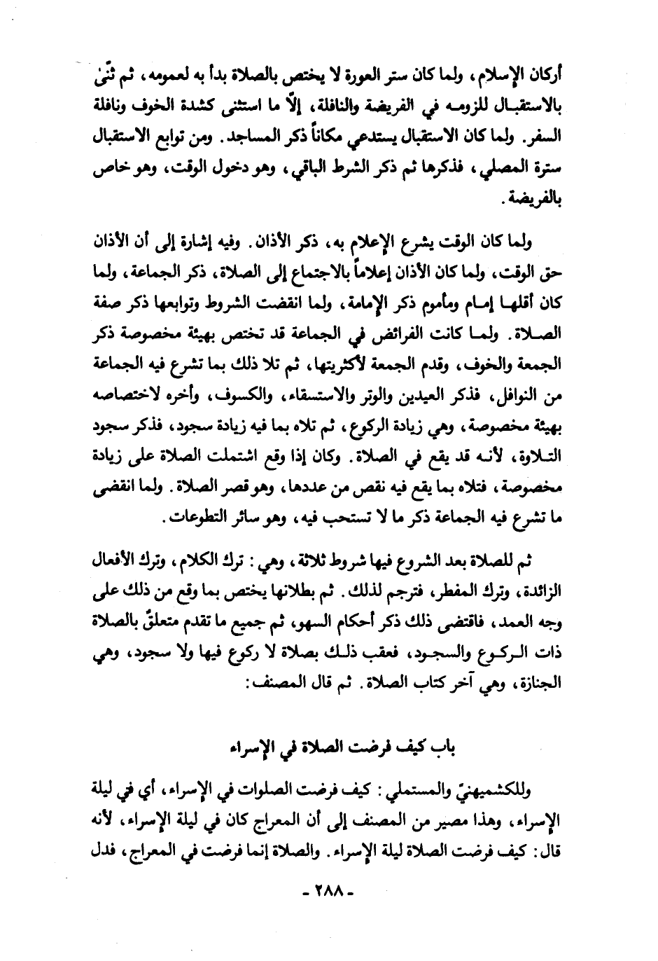 أركان الإِسلام، ولما كان ستر العورة لا يختص بالصلاة بدأ به لعمومه، ثم ثنى بالاستقبال للزومه في الفريضة والنافلة، إلَّا ما استثنى كشدة الخوف ونافلة السفر. ولما كان الاستقبال يستدعي مكاناً ذكر المساجد. ومن توابع الاستقبال سترة المصلي، فذكرها ثم ذكر الشرط الباقي، وهو دخول الوفت، وهو خاص بالفريضة.