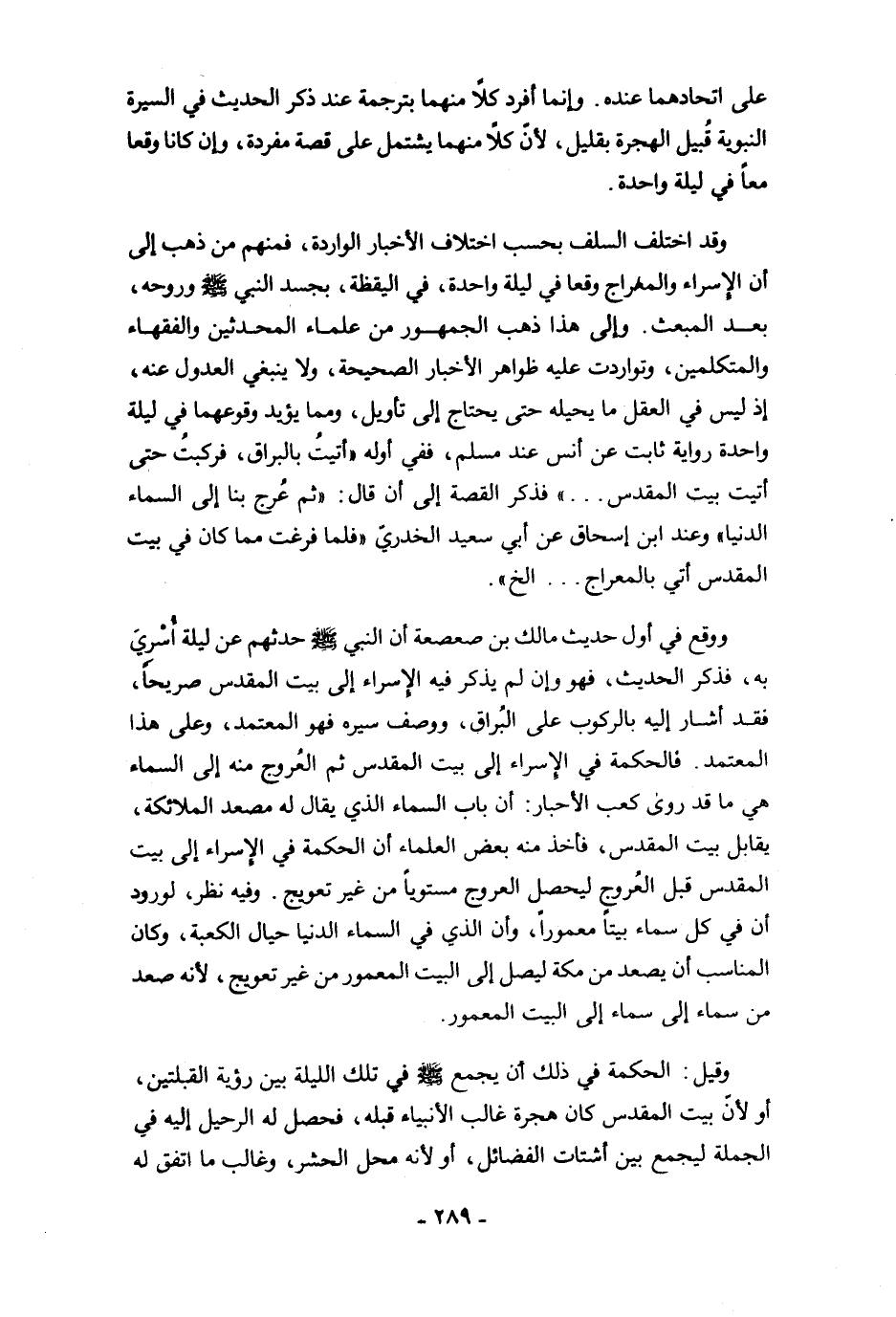 وقد اختلف السلف بحسب اختلاف الأخبار الواردة، فمنهم من ذهب إلى أن الإسراء والمعراج وقعا في ليلة واحدة، في اليقظة، بجسد النبي -صلى الله عليه وسلم- وروحه، بعد المبعث. وإلى هذا ذهب الجمهور من علماء المحدثين والفقهاء والمتكلمين، وتواردت عليه ظواهر الأخبار الصحيحة، ولا ينبغي العدول عنه، إذ ليس في العقل ما يحيله حتى يحتاج إلى تأويل، ومما يؤيد وقوعهما في ليلة واحدة رواية ثابت عن أنس عند مسلم، ففي أوله "أتيتُ بالبراق، فركبتُ حتى أتيت بيت المقدس ... " فذكر القصة إلى أن قال: "ثم عُرج بنا إلى السماء الدنيا" وعند ابن إسحاق عن أبي سجد الخدريّ "فلما فرغت مما كان في بيت المقدس أتي بالمعراج ... الخ".