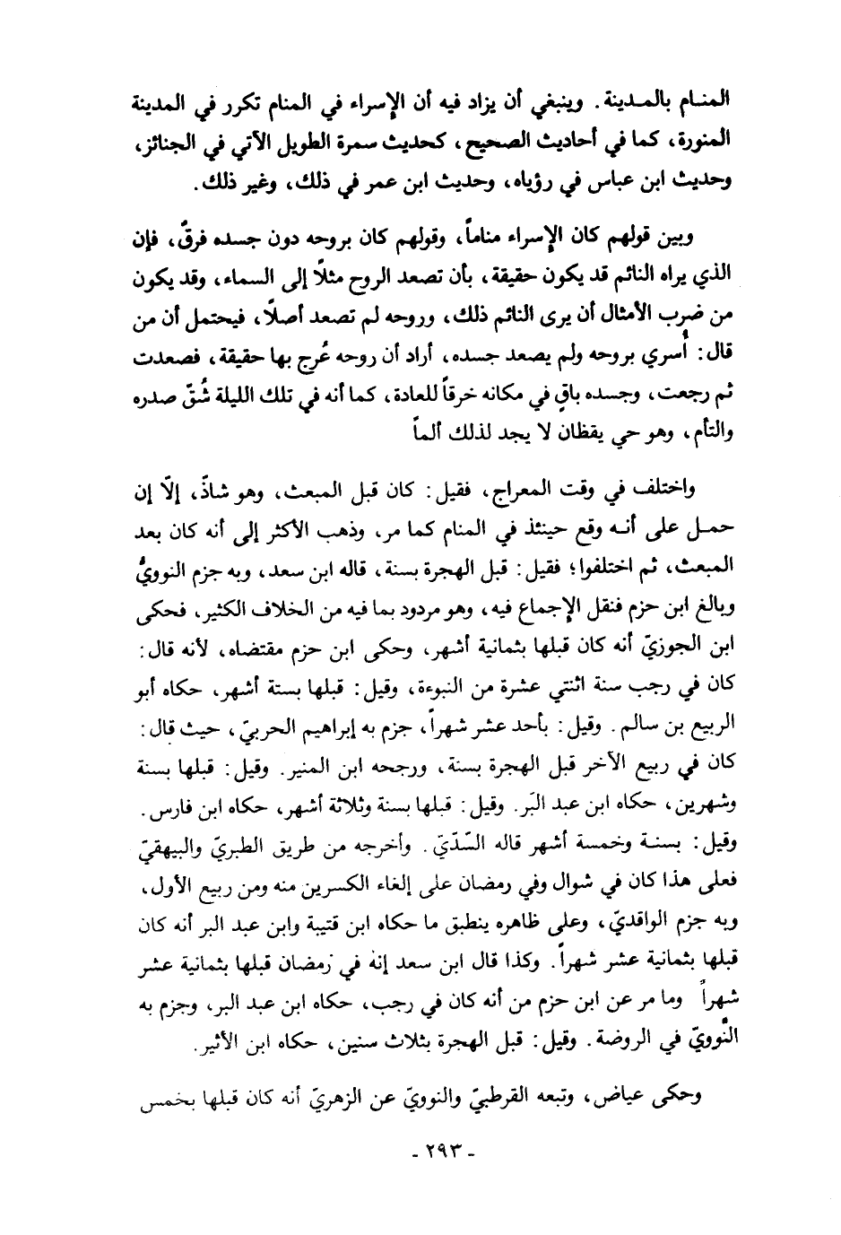 واختلف في وقت المعراج، فقيل: كان قبل المبعث، وهو شاذٌ، إلَّا ان حمل على أنه وقع حينئذ في المنام كما مرَّ، وذهب أكثر إلى أنه كان بعد المبعث، ثم اختلفوا؛ فقيل: قبل الهجرة بسنة، قاله ابن سعد، وبه جزم النوويُّ وبالغ ابن حزم فنقل الإجماع فيه، وهو مردود بما فيه من الخلاف الكثير، فحكى ابن الجوزيّ أنه كان قبلها بثمانية أشهر، وحكى ابن حزم مقتضاه، لأنه قال: كان في رجب سنة اثنتي عشرة من النبوءة، وقيل: قبلها بستة أشهر، حكاه أبو الربيع بن سالم. وقيل: بأحد عشر شهرًا، جزم به إبراهيم الحربيّ، حيث قال: كان في ربيع الآخر قبل الهجرة بسنة، ورجحه ابن المنير. وقيل: قبلها بسنة وشهرين، حكاه ابن عبد البر. وقيل: قبلها بسنة وثلاثة أشهر، حكاه ابن فارس. وقيل: بسنة وخمسة أشهر قاله السدّيّ. وأخرجه من طريق الطبريّ والبيهقيّ فعلى هذا كان في شوال وفي رمضاد على إلغاء الكسرين منه ومن ربيع الأول، وبه جزم الواقديّ، وعلى ظاهره ينطبق ما حكاه ابن قتيبة وابن عبد البر أنه كان قبلها بثمانية عشر شهرًا. وكذا قال ابن سعد إنة في رمضان قبلها بثمانية عشر شهرًا وما مرَّ عن ابن حزم من أنه كان في رجب، حكاه ابن عبد البر، وجزم به النّوويّ في الروضة. وقيل: قبل الهجرة بثلاث سنين، حكاه ابن الأثير.