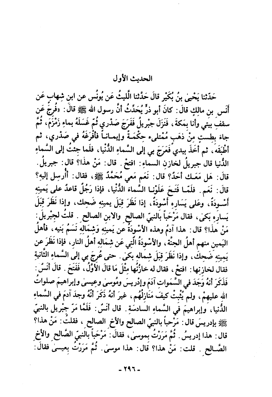 حَدَّثَنَا يَحْيَى بْنُ بُكَيْرٍ قَالَ حَدَّثَنَا اللَّيْثُ عَنْ يُونُسَ عَنِ ابْنِ شِهَابٍ عَنْ أَنَسِ بْنِ مَالِكٍ قَالَ: كَانَ أَبُو ذَرٍّ يُحَدِّثُ أَنَّ رَسُولَ اللَّهِ -صلى الله عليه وسلم- قَالَ: "فُرِجَ عَنْ سَقْفِ بَيْتِي وَأَنَا بِمَكَّةَ، فَنَزَلَ جِبْرِيلُ فَفَرَجَ صَدْرِي، ثُمَّ غَسَلَهُ بِمَاءِ زَمْزَمَ، ثُمَّ جَاءَ بِطَسْتٍ مِنْ ذَهَبٍ مُمْتَلِىء حِكْمَةً وَإِيمَانًا، فَأَفْرَغَهُ فِي صَدْرِي ثُمَّ أَطْبَقَهُ، ثُمَّ أَخَذَ بِيَدِي فَعَرَجَ بِي إِلَى السَّمَاءِ الدُّنْيَا، فَلَمَّا جِئْتُ إِلَى السَّمَاءِ الدُّنْيَا قَالَ جِبْرِيلُ لِخَازِنِ السَّمَاءِ: افْتَحْ. قَالَ: مَنْ هَذَا؟ قَالَ: جِبْرِيلُ. قَالَ: هَلْ مَعَكَ أَحَدٌ؟ قَالَ: نَعَمْ مَعِي مُحَمَّدٌ -صلى الله عليه وسلم-. فَقَالَ: أُرْسِلَ إِلَيْهِ؟ قَالَ: نَعَمْ. فَلَمَّا فَتَحَ عَلَوْنَا السَّمَاءَ الدُّنْيَا، فَإِذَا رَجُلٌ قَاعِدٌ عَلَى يَمِينِهِ أَسْوِدَةٌ وَعَلَى يَسَارِهِ أَسْوِدَةٌ، إِذَا نَظَرَ قِبَلَ يَمِينِهِ ضَحِكَ، وَإِذَا نَظَرَ قِبَلَ يَسَارِهِ بَكَى، فَقَالَ مَرْحَبًا بِالنَّبِيِّ الصَّالِحِ وَالاِبْنِ الصَّالِحِ. قُلْتُ لِجِبْرِيلَ: مَنْ هَذَا؟ قَالَ: هَذَا آدَمُ. وَهَذِهِ الأَسْوِدَةُ عَنْ يَمِينِهِ وَشِمَالِهِ نَسَمُ بَنِيهِ، فَأَهْلُ الْيَمِينِ مِنْهُمْ أَهْلُ الْجَنَّةِ، وَالأَسْوِدَةُ الَّتِي عَنْ شِمَالِهِ أَهْلُ النَّارِ، فَإِذَا نَظَرَ عَنْ يَمِينِهِ ضَحِكَ، وَإِذَا نَظَرَ قِبَلَ شِمَالِهِ بَكَى، حَتَّى عَرَجَ بِي إِلَى السَّمَاءِ الثَّانِيَةِ فَقَالَ لِخَازِنِهَا: افْتَحْ. فَقَالَ لَهُ خَازِنُهَا مِثْلَ مَا قَالَ الأَوَّلُ، فَفَتَحَ. قَالَ أَنَسٌ: فَذَكَرَ أَنَّهُ وَجَدَ فِى السَّمَوَاتِ آدَمَ وَإِدْرِيسَ وَمُوسَى وَعِيسَى وَإِبْرَاهِيمَ صَلَوَاتُ اللَّهِ عَلَيْهِمْ، وَلَمْ يُثْبِتْ كَيْفَ مَنَازِلُهُمْ، غَيْرَ أَنَّهُ ذَكَرَ أَنَّهُ وَجَدَ آدَمَ فِي السَّمَاءِ الدُّنْيَا، وَإِبْرَاهِيمَ فِي السَّمَاءِ السَّادِسَةِ. قَالَ أَنَسٌ: فَلَمَّا مَرَّ جِبْرِيلُ بِالنَّبِيِّ -صلى الله عليه وسلم- بِإِدْرِيسَ قَالَ: مَرْحَبًا بِالنَّبِيِّ الصَّالِحِ وَالأَخِ الصَّالِحِ. فَقُلْتُ: مَنْ هَذَا؟ قَالَ؟ هَذَا إِدْرِيسُ. ثُمَّ مَرَرْتُ بِمُوسَى فَقَالَ: مَرْحَبًا بِالنَّبِيِّ الصَّالِحِ وَالأَخِ الصَّالِحِ. قُلْتُ: مَنْ هَذَا؟ قَالَ: هَذَا مُوسَى. ثُمَّ مَرَرْتُ بِعِيسَى فَقَالَ:
