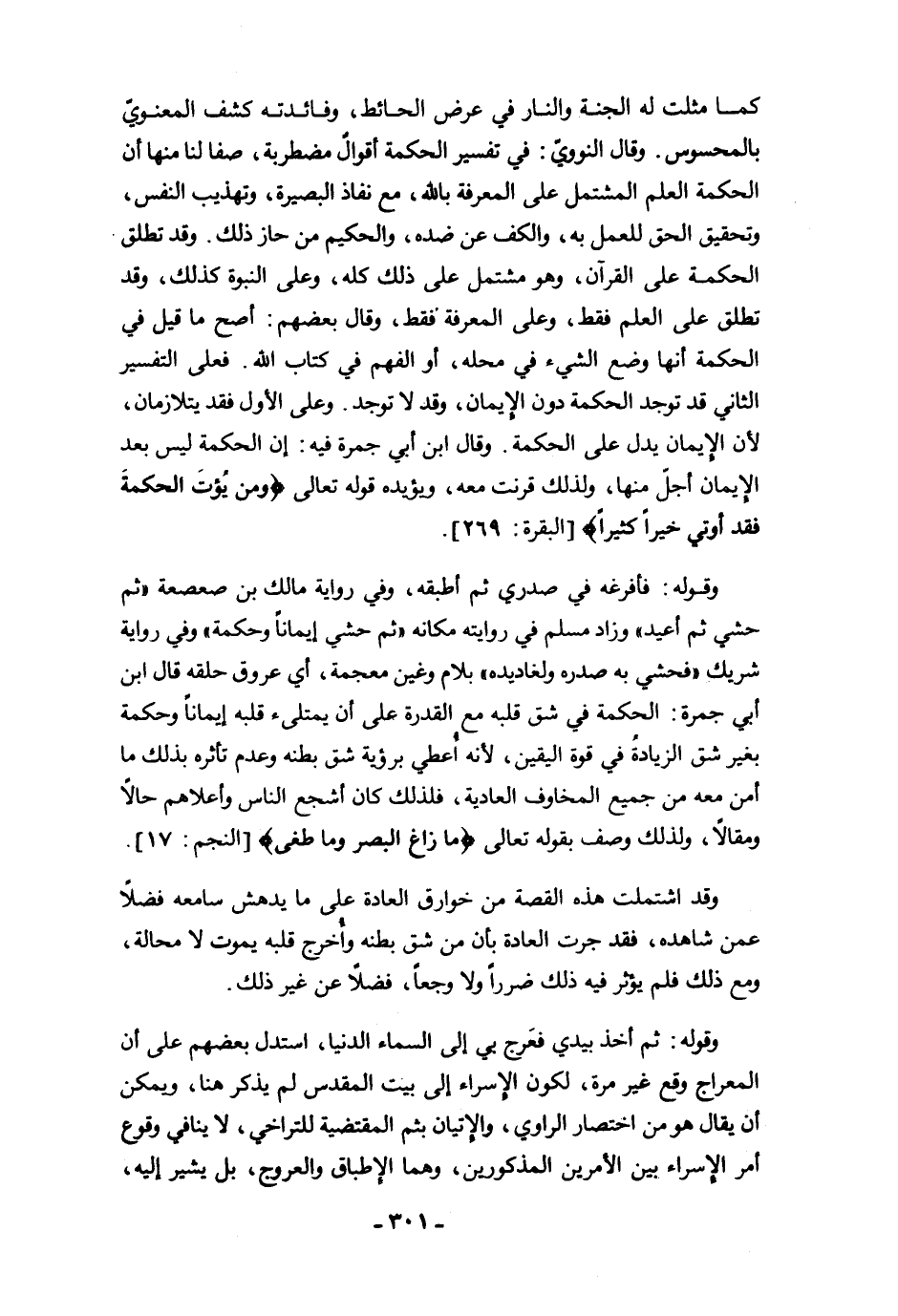 كما مثلت له الجنة والنار في عرض الحائط، وفائدته كشف المعنويّ بالمحسوس. وقال النوويّ: في تفسير الحكمة أقوالٌ مضطربة، صفا لنا منها أن الحكمة العلم المشتمل على المعرفة بالله، مع نفاذ البصيرة، وتهذيب النفس، وتحقيق الحق للعمل به، والكف عن ضده، والحكيم من حاز ذلك. وقد تطلق. الحكمة على القرآن، وهو مشتمل على ذلك كله، وعلى النبوة كذلك، وقد تطلق على العلم فقط، وعلى المعرفة فقط، وقال بعضهم: أصح ما قيل في الحكمة أنها وضع الشيء في محله، أو الفهم في كتاب الله. فعلى التفسير الثاني قد توجد الحكمة دون الإيمان، وقد لا توجد. وعلى الأول فقد يتلازمان، لأن الإيمان يدل على الحكمة. وقال ابن أبي جمرة فيه: إن الحكمة ليس بعد الإيمان أجل منها، ولذلك قرنت معه، ويؤيده قوله تعالى {يُؤْتِي الْحِكْمَةَ مَنْ يَشَاءُ وَمَنْ يُؤْتَ الْحِكْمَةَ فَقَدْ أُوتِيَ خَيْرًا كَثِيرًا} [البقرة: 269].