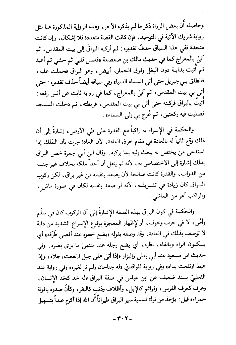 والحكمة في الإسراء به راكبًا مع القدرة على طي الأرض، إشارةٌ إلى أن ذلك وقع ثانيًا له بالعادة في مقام خرق العادة، لأن العادة جرت بان المَلَك إذا استدعى من يختص به يبعث إليه بما يركبه. وقال ابن أبي جمرة خص البراق بذلك إشارة إلى الاختصاص به، لأنه لم ينقل أن أحدًا ملكه بخلاف غير جنسه من الدواب، والقدرة كانت صالحة لأن يصعد بنفسه من غير براق، لكن ركوب البراق كان زيادة في تشريفه، لأنه لو صعد بنفسه لكان في صورة ماشٍ، والراكب أعز من الماشي.