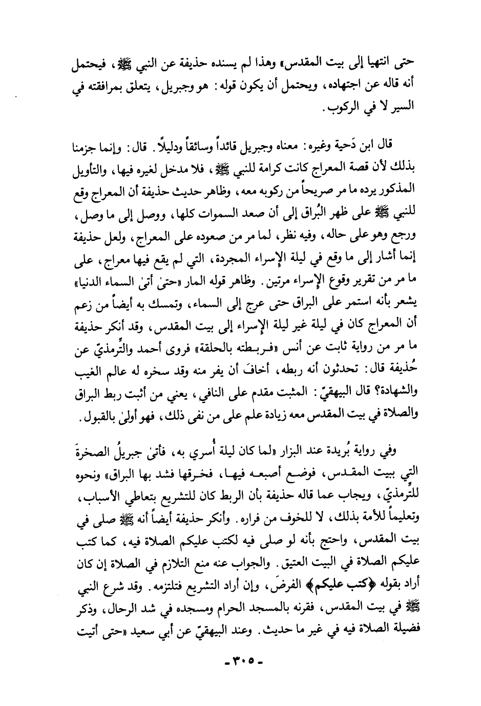 وفي رواية بُريدة عند البزار "لما كان ليلة أُسري به، فأتى جبريلُ الصخرةَ التي ببيت المقدس، فوضع أصبعه فيها، فخرقها فشد بها البراق" ونحوه للتِّرمذيّ، ويجاب عما قاله حذيفة بأن الربط كان للتشريع بتعاطي الأسباب، وتعليمًا للأمة بذلك، لا للخوف من فراره. وأنكر حذيفة أيضًا أنه -صلى الله عليه وسلم- صلى في بيت المقدس، واحتج بأنه لو صلى فيه لكتب عليكم الصلاة فيه، كما كتب عليكم الصلاة في البيت العتيق. والجواب عنه منع التلازم في الصلاة إن كان أراد بقوله {كُتِبَ عَلَيْكُمُ} الفرضَ، وإن أراد التشريع فتلتزمه. وقد شرع النبي -صلى الله عليه وسلم- في بيت المقدس، فقرنه بالمسجد الحرام ومسجده في شد الرحال، وذكر فضيلة الصلاة فيه في غير ما حديث. وعند البيهقيّ عن أبي سعيد "حتى أتيت