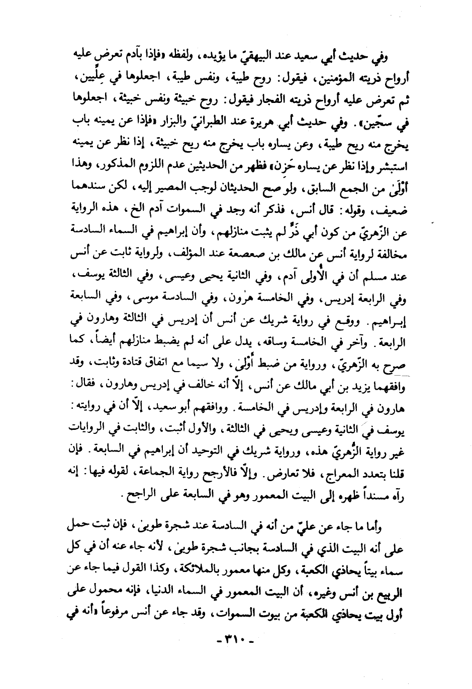 وأما ما جاء عن علي من أنه في السادسة عند شجرة طوبي، فإن ثبت حمل على أنه البيت الذي في السادسة بجانب شجرة طوبي، لأنه جاء عنه أن في كل سماء بيتًا يحاذي الكعبة، وكل منها معمور بالملانكة، وكذا القول فيما جاء عن الربيع بن أنس وغيره، إن البيت المعمور في السماء الدنيا، فإنه محمول على أول بيت يحاذي الكعبة من بيوت السموات، وقد جاء عن أنس مرفوعًا "أنه في