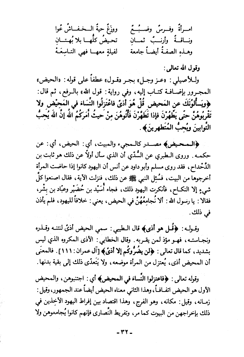 وللأصيلي: "عَزَّ وَجَلَّ" بجر "قول" عطفًا على قوله: "الحيض" المجرور بإضافة كتاب إليه، وفي رواية: "قول الله" بالرفع، ثم قال: {وَيَسْأَلُونَكَ عَنِ الْمَحِيضِ قُلْ هُوَ أَذًى فَاعْتَزِلُوا النِّسَاءَ فِي الْمَحِيضِ وَلَا تَقْرَبُوهُنَّ حَتَّى يَطْهُرْنَ فَإِذَا تَطَهَّرْنَ فَأْتُوهُنَّ مِنْ حَيْثُ أَمَرَكُمُ اللَّهُ إِنَّ اللَّهَ يُحِبُّ التَّوَّابِينَ وَيُحِبُّ الْمُتَطَهِّرِينَ}.