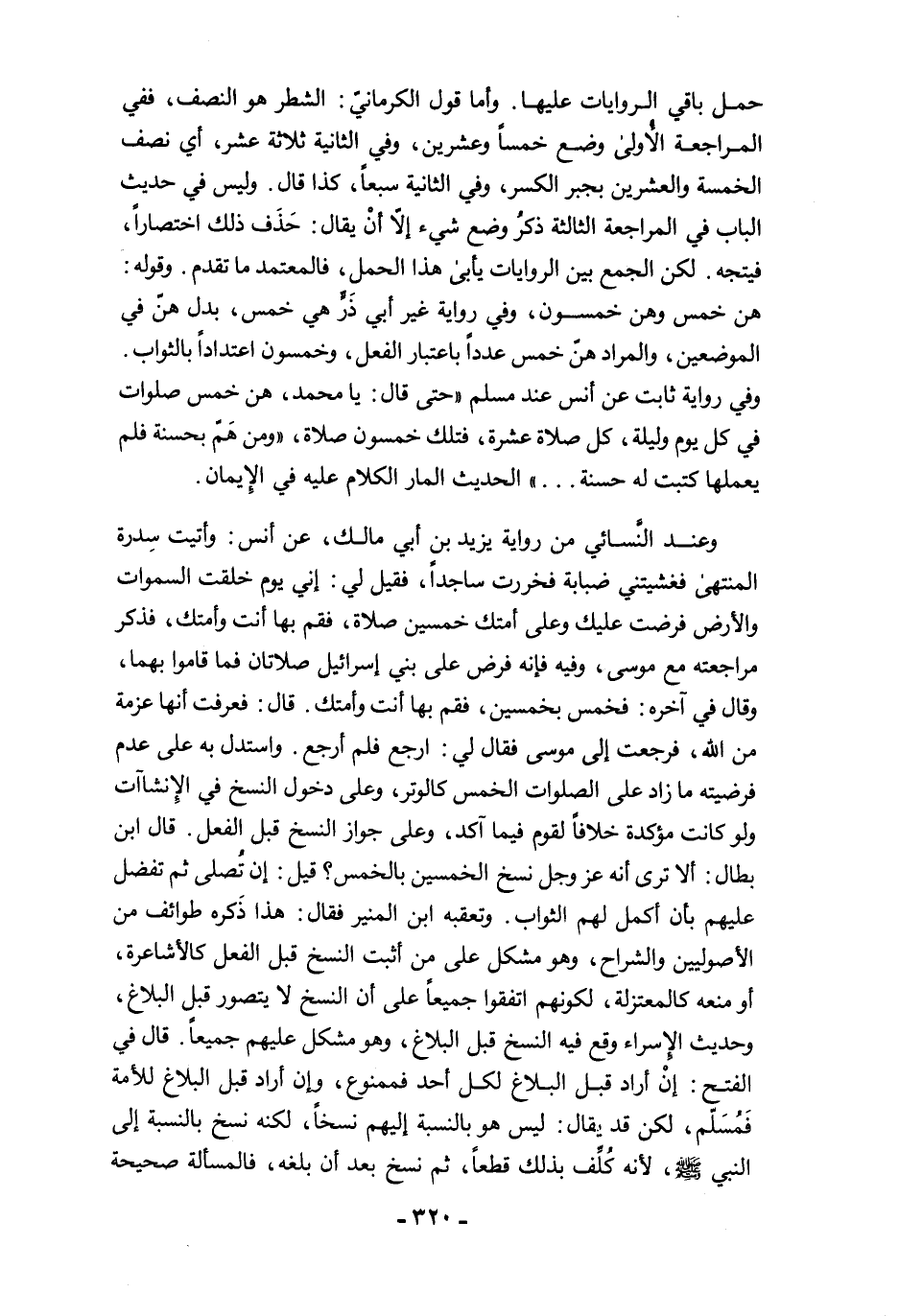 وعند النَّسائي من رواية يزيد بن أبي مالك، عن أنس: وأتيت سِدرة المنتهى فغشيتني ضبابة فخررت ساجدًا، فقيل لي: إني يوم خلقت السموات والأرض فرضت عليك وعلى أمتك خمسين صلاة، فقم بها أنت وأمتك، فذكر مراجعته مع موسى، وفيه فإنه فرض علي بني إسرائيل صلاتان فما قاموا بهما، وقال في آخره: فخمس بخمسين، فقم بها أنت وأمتك. قال: فعرفت أنها عزمة من الله، فرجعت إلى موسى فقال لي: ارجع فلم أرجع. واستدل به على عدم فرضيته ما زاد على الصلوات الخمس كالوتر، وعلى دخول النسخ في الإِنشاآت ولو كانت مؤكدة خلافًا لقوم فيما آكد، وعلى جواز النسخ قبل الفعل. قال ابن بطال: ألا ترى أنه عَزَّ وَجَلَّ نسخ الخمسين بالخمس؟ قيل: إن تُصلى ثم تفضل عليهم بان أكمل لهم الثواب. وتعقبه ابن المنير فقال: هذا ذَكره طوائف من الأصوليين والشراح، وهو مشكل على من أثبت النسخ قبل الفعل كالأشاعرة، أو منعه كالمعتزلة، لكؤلهم اتفقوا جميعًا على أن النسخ لا يتصور قبل البلاغ، وحديث الإِسراء وقع فيه النسخ قبل البلاغ، وهو مشكل عليهم جميعًا. قال في الفتح: إنْ أراد قبل البلاغ لكل أحد فممنوع، وإن أراد قبل البلاغ للأمة فَمُسَلّم، لكن قد يقال: ليس هو بالنسبة إليهم نسخًا، لكنه نسخ بالنسبة إلى النبي -صلى الله عليه وسلم-، لأنه كُلِّف بذلك قطعًا، ثم نسخ بعد أن بلغه، فالمسألة صحيحة