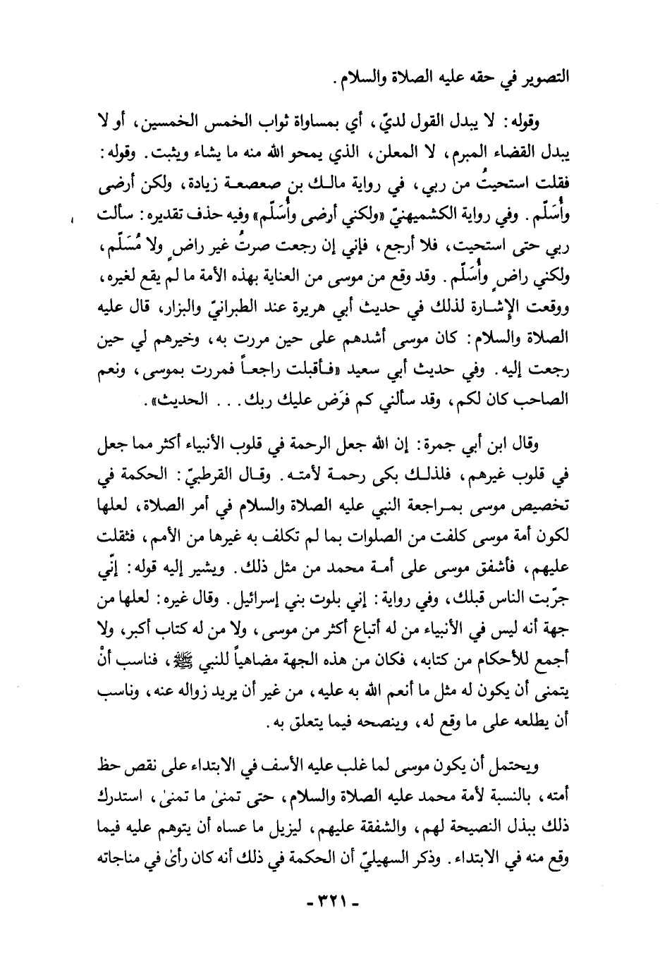 وقال ابن أبي جمرة: إن الله جعل الرحمة في قلوب الأنبياء أكثر مما جعل في قلوب غيرهم، فلذلك بكى رحمة لأمته. وقال القرطبي: الحكمة في تخصيص موسى بمراجعة النبي عليه الصلاة والسلام في أمر الصلاة، لعلها لكون أمة موسى كلفت من الصلوات بما لم تكلف به غيرها من الأمم، فثقلت عليهم، فأشفق موسى على أمة محمد من مثل ذلك. ويشير إليه قوله: إنّي جرّبت الناس قبلك، وفي رواية: إني بلوت بني إسرائيل. وقال غيره: لعلها من جهة أنه ليس في الأنبياء من له أتباع أكثر من موسى، ولا من له كتاب أكبر، ولا أجمع للأحكام من كتابه، فكان من هذه الجهة مضاهيًا للنبي -صلى الله عليه وسلم-، فناسب أنْ يتمنى أن يكون له مثل ما أنعم الله به عليه، من غير أن يريد زواله عنه، وناسب أن يطلعه على ما وقع له، وينصحه فيما يتعلق به.