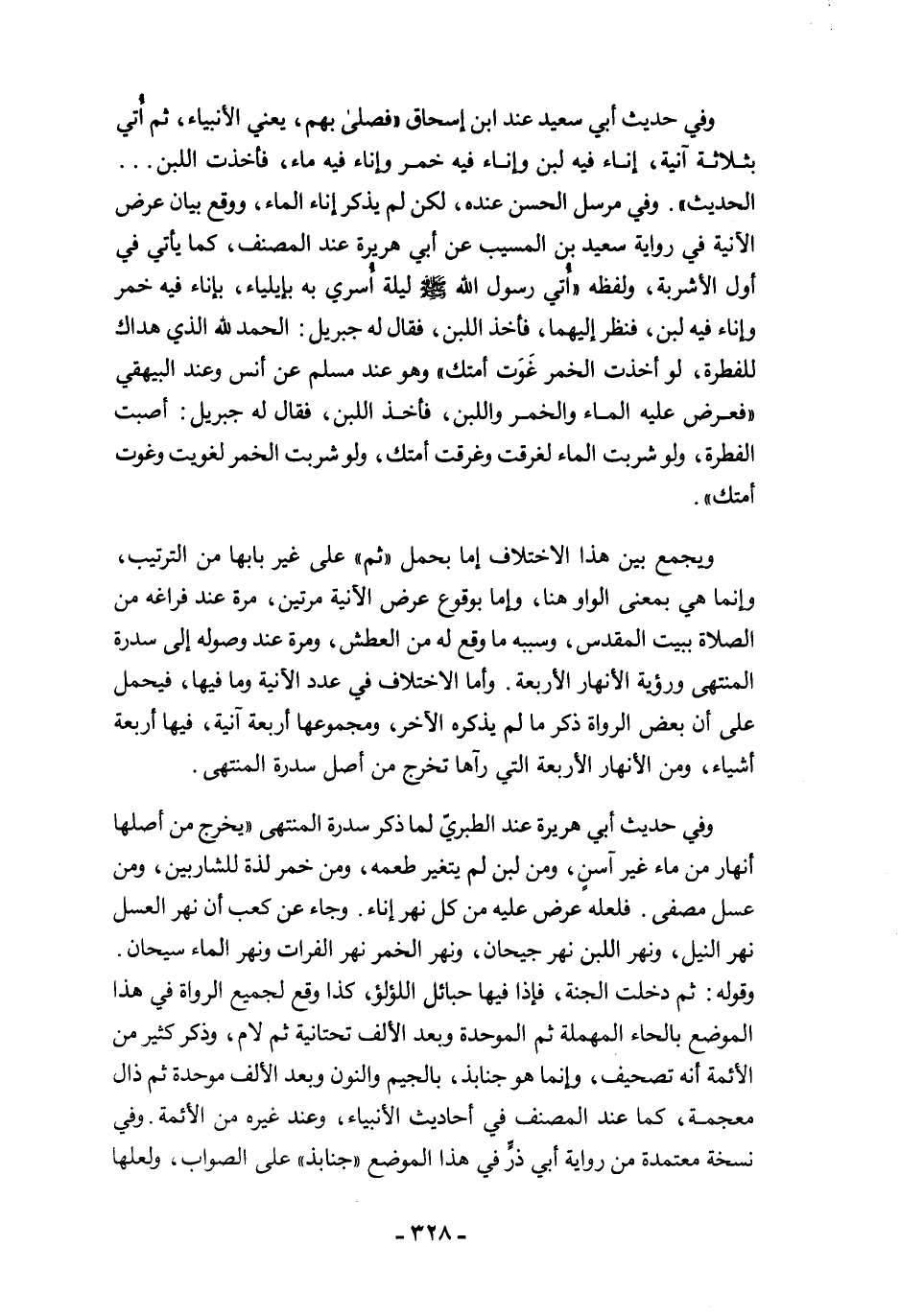 ويجمع بين هذا الاختلاف إما يحمل "ثم" على غير بابها من الترتيب، وإنما هي بمعنى الواو هنا، وإما بوقوع عرض الآنية مرتين، مرة عند فراغه من الصلاة ببيت المقدس، وسببه ما وقع له من العطش، ومرة عند وصوله إلى سدرة المنتهى ورؤية الأنهار الأربعة. وأما الاختلاف في عدد الأنية وما فيها، فيحمل على أن بعض الرواة ذكر ما لم يذكره الآخر، ومجموعها أربعة آنية، فيها أربعة أشياء، ومن الأنهار الأربعة التي رآها تخرج من أصل سدرة المنتهى.