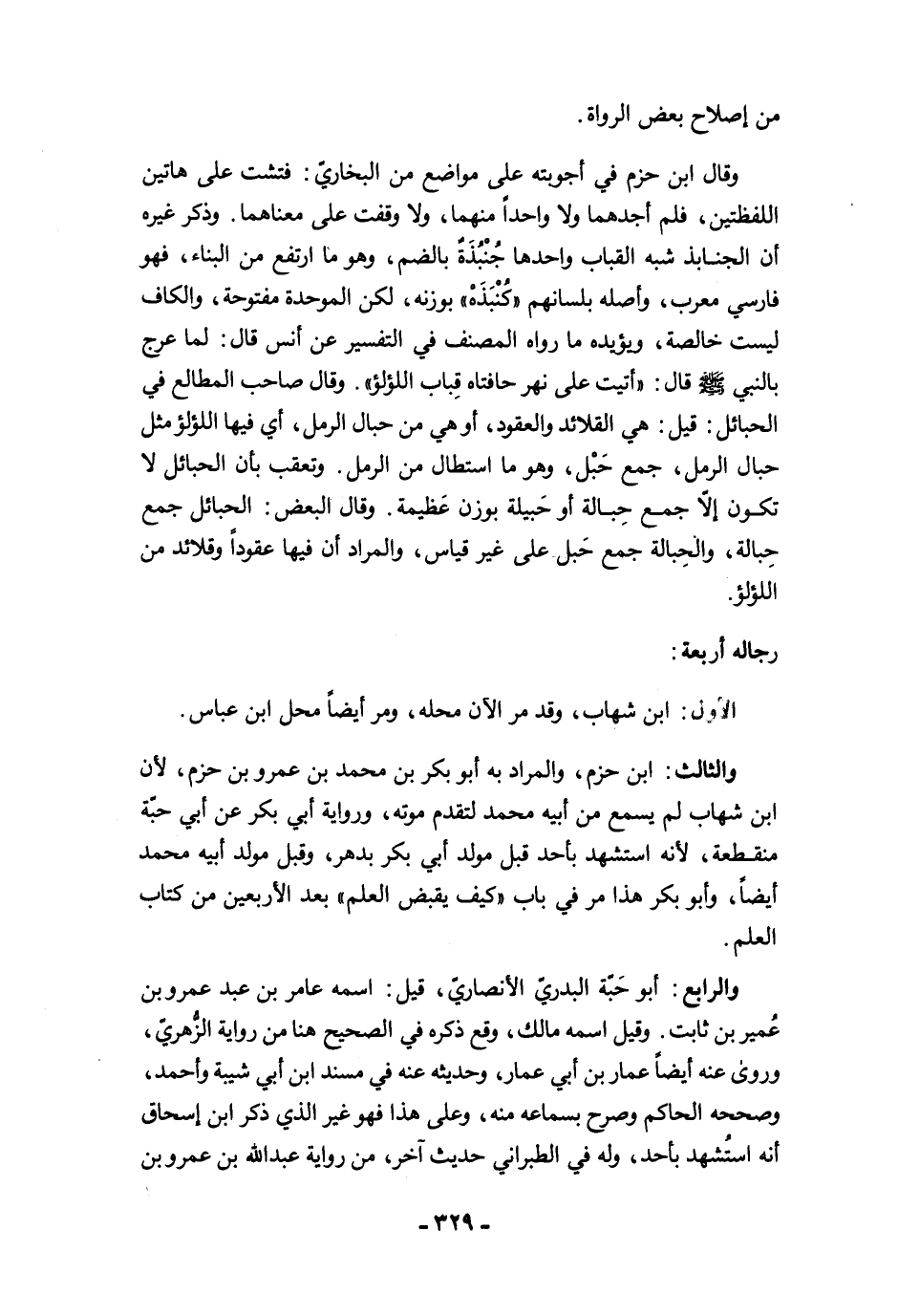 والثالث: ابن حزم، والمراد به أبو بكر بن محمد بن عمرو بن حزم؛ لأن ابن شهاب لم يسمع من أبيه محمد لتقدم موته، ورواية أبي بكر عن أبي حبّة منقطعة، لأنه استشهد بأحد قبل مولد أبي بكر بدهر، وقبل مولد أبيه محمد أيضًا، وأبو بكر هذا مرَّ في باب "كيف يقبض العلم" بعد الأربعين من كتاب العلم.