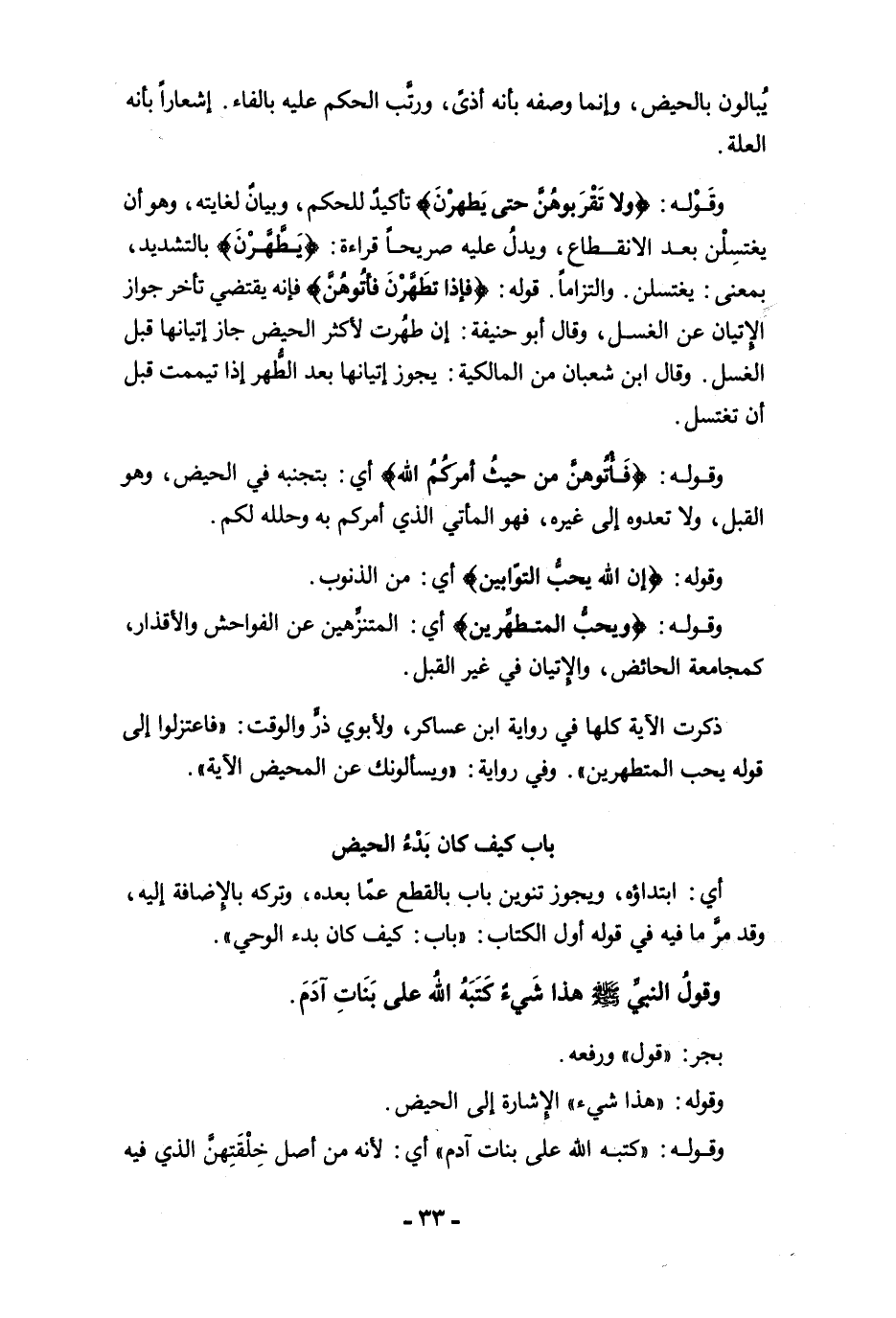 ذكرت الآية كلها في رواية ابن عساكر، ولأبوي ذرٍّ والوقت: "فاعتزلوا إلى قوله يحب المتطهرين". وفي رواية: "ويسألونك عن المحيض الآية".