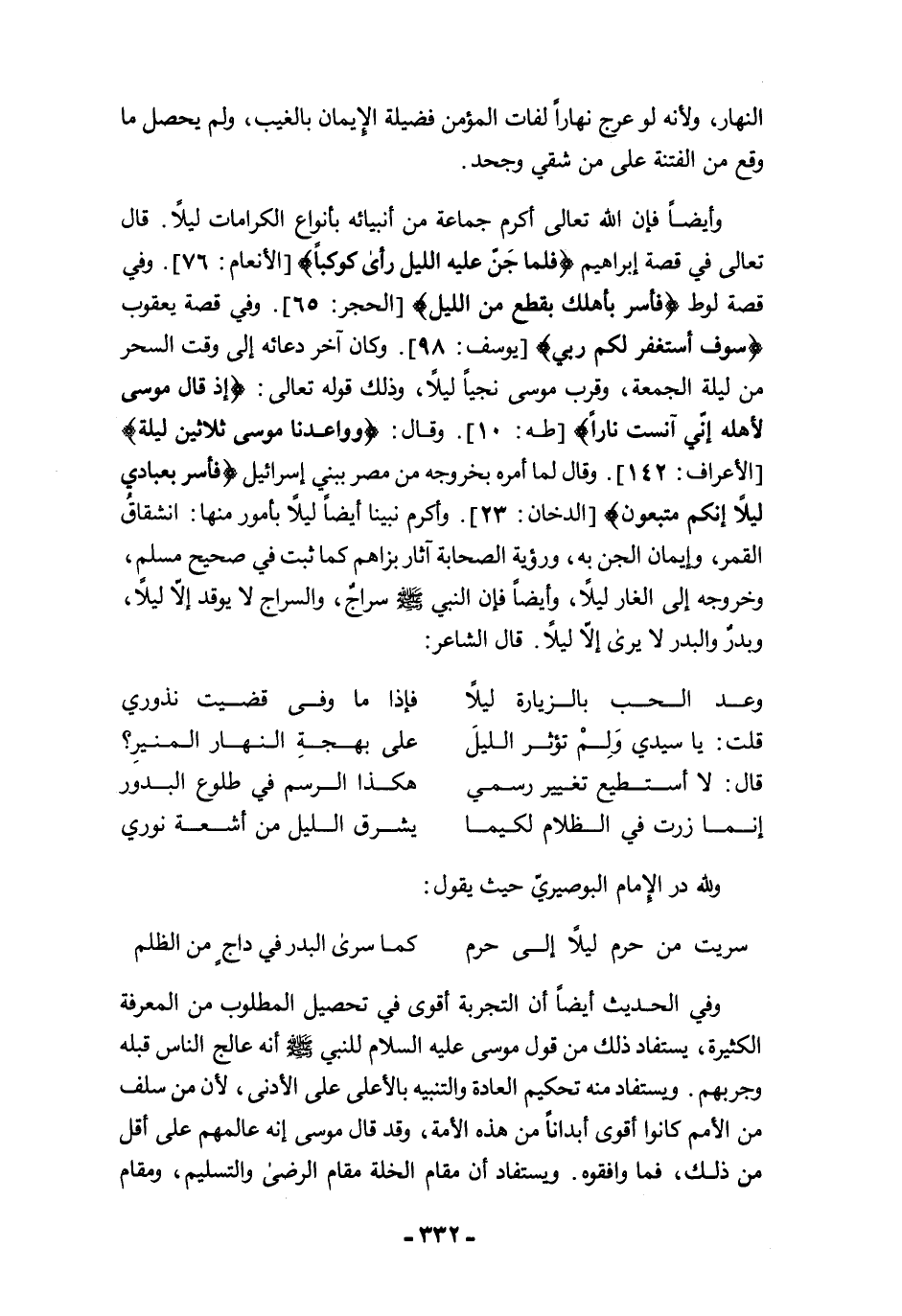 وأيضًا فإن الله تعالى أكرم جماعة من أنبيائه بأنواع الكرامات ليلًا. قال تعالى في قصة إبراهيم {فَلَمَّا جَنَّ عَلَيْهِ اللَّيْلُ رَأَى كَوْكَبًا} [الأنعام: 76]. وفي قصة لوط {فَأَسْرِ بِأَهْلِكَ بِقِطْعٍ مِنَ اللَّيْلِ} [الحجر: 65]. وفي قصة يعقوب {سَوْفَ أَسْتَغْفِرُ لَكُمْ رَبِّي} [يوسف: 98] وكان آخر دعائه إلى وقت السحر من ليلة الجمعة، وقرب موسى نجيًا ليلًا، وذلك قوله تعالى: {إِذْ قَالَ مُوسَى لِأَهْلِهِ إِنِّي آنَسْتُ نَارًا} [النمل: 7]. وقال: {وَوَاعَدْنَا مُوسَى ثَلَاثِينَ لَيْلَةً} [الأعراف: 142]. وقال لما أمره بخروجه من مصر ببني إسرائيل {فَأَسْرِ بِعِبَادِي لَيْلًا إِنَّكُمْ مُتَّبَعُونَ} [الدخان: 23]. وأكرم نبينا أيضًا ليلًا بأمور منها: انشقاقُ القمر، وإيمان الجن به، ورؤية الصحابة آثار بزاهم كما ثبت في صحيح مسلم، وخروجه إلى الغار ليلًا، وأيضًا فإن النبي -صلى الله عليه وسلم- سراجٌ، والسراج لا يوقد إلَّا ليلًا، وبدرٌ والبدر لا يرى إلَّا ليلًا. قال الشاعر: