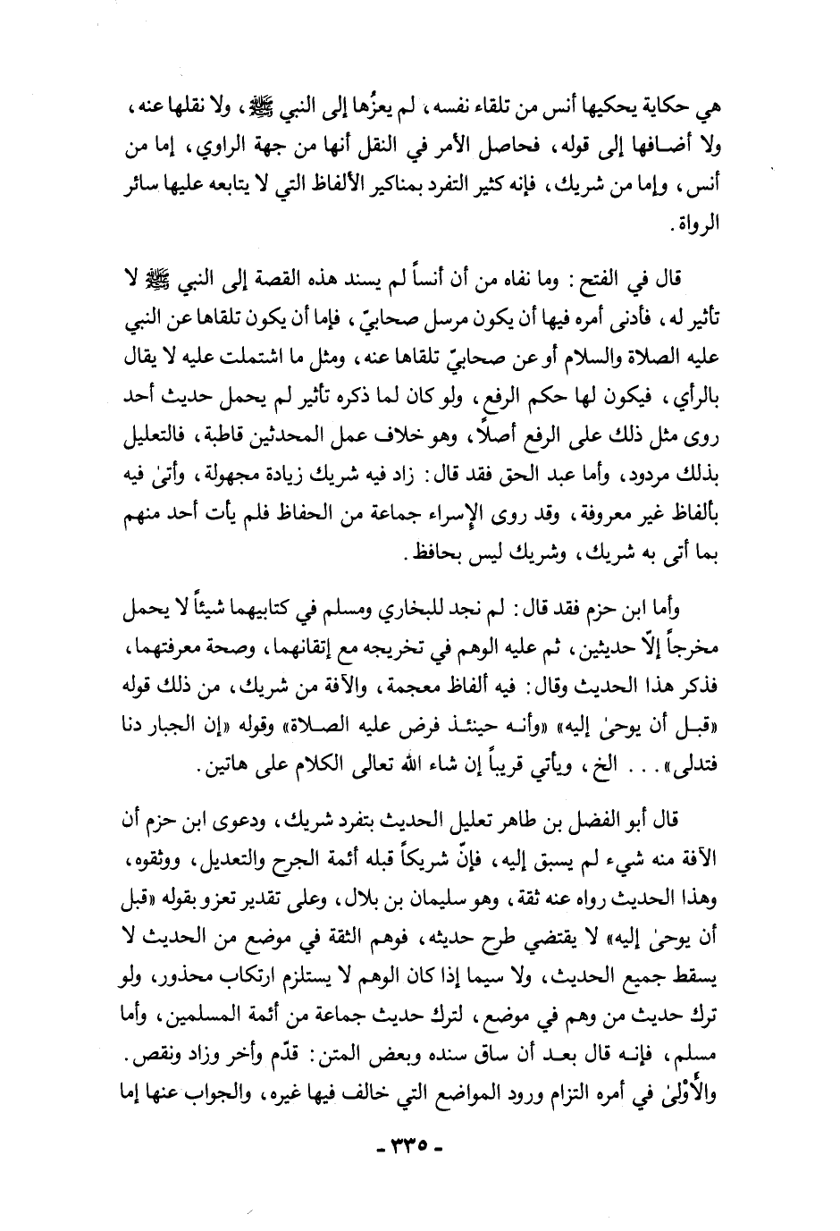 قال أبو الفضل بن طاهر تعليل الحديث بتفرد شريك، ودعوى ابن حزم أن الآفة منه شيء لم يسبق إليه، فإنّ شريكًا قبله أئمة "الجرح والتعديل" ووثقوه، وهذا الحديث رواه عنه ثقة، وهو سليمان بن بلال، وعلى تقدير تعزو بقوله "قبل أن يوحى إليه" لا يقتضي طرح حديثه، فوهم الثقة في موضع من الحديث لا يسقط جميع الحديث، ولاسيما إذا كان الوهم لا يستلزم ارتكاب محذور، ولو ترك حديث من وهم في موضع، لترك حديث جماعة من أئمة المسلمين، وأما مسلم، فإنه قال بعد أن ساق سنده وبعض المتن: قدَّم وأخر وزاد ونقص. والأوْلي في أمره التزام ورود المواضع التي خالف فيها غيره، والجواب عنها إما
