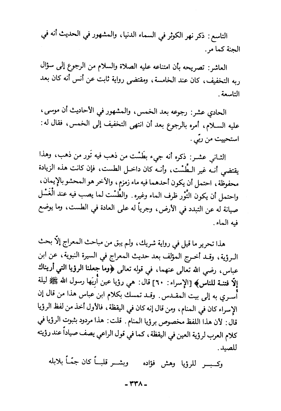 هذا تحرير ما قيل في رواية شريك، ولم يبق من مباحث المعراج إلَّا بحث الرؤية، وقد أخرج المؤلف بعد حديث المعراج في السيرة النبوية، عن ابن عباس، رضي الله تعالى عنهما، في قوله تعالى {وَمَا جَعَلْنَا الرُّؤْيَا الَّتِي أَرَيْنَاكَ إِلَّا فِتْنَةً لِلنَّاسِ} [الإسراء: 60] قال: هي رؤيا عين أُرِيَها رسول الله -صلى الله عليه وسلم- ليلة أُسري به إلى بيت المقدس. وقد تمسك بكلام ابن عباس هذا من قال إن الإسراء كان في المنام، ومن قال إنه كان في اليقظة، فالأول أخذ من لفظ الرؤيا قال: لأن هذا اللفظ مخصوص برؤيا المنام. قلت: هذا مردود بثبوت الرؤيا في كلام العرب لرؤية العين في اليقظة، كما في قول الراعي يصف صيادًا عند رؤيته للصيد.