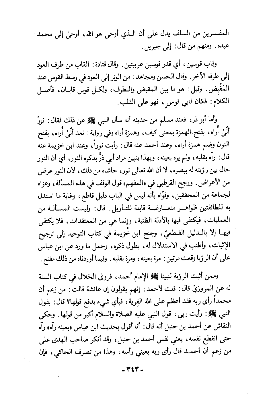 وأما أبو ذر، فعند مسلم من حديثه أنه سأل النبي -صلى الله عليه وسلم- عن ذلك فقال: نورٌ أنّى أَراه، بفتح، الهمزة بمعنى كيف، وهمزة أراه وفي رواية: نعد أنّى أُراه، بفتح النون وضم همزة أراه، وعند أحمد عنه قال: رأيت نورًا، وعند ابن خزيمة عنه قال: رآه بقلبه، ولم يره بعينه، وبهذا يتبين مراد أبي ذرٍّ بذكره النور، أي أن النور حال بين رؤيته له ببصره، لا أن الله تعالى نور، حاشاه من ذلك؛ لأنّ النور عرض من الأعراض. ورجح القرطبي في "المفهم" قول الوقف في هذه المسألة، وعزاه لجماعة من المحققين، وقوّاه بأنه ليس في الباب دليل قاطع، وغاية ما استدل به للطائفتين ظواهر متعارضة قابلة للتأويل. قال: وليست المسألة من العمليات، فيكتفى فيها بالأدلة الظنية، وإنما هي من المعتقدات، فلا يكتفى فيها إلا بالدليل القطعيّ، وجنح ابن خُزيمة في كتاب التوحيد إلى ترجيح الإثبات، وأطنب في الاستدلال له، يطول ذكره، وحمل ما ورد عن ابن عباس على أن الرؤيا وقعت مرتين: مرة بعينه، ومرة بقلبه. وفيما أوردناه من ذلك مقنع.