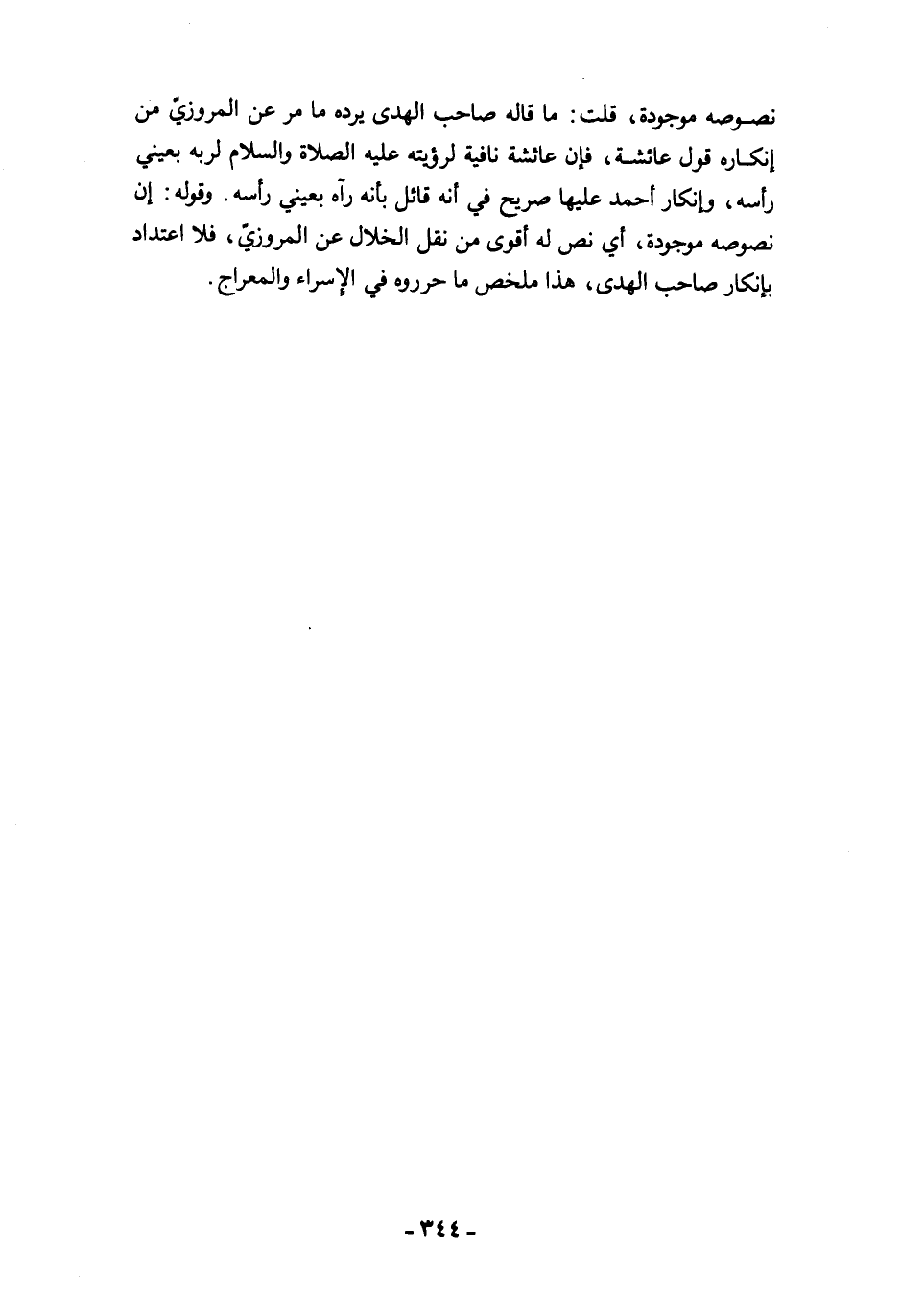 نصوصه موجودة، قلت: ما قاله صاحب الهدى يرده ما مرَّ عن المروزيّ من إنكاره قول عائشة، فإن عائشة نافية لرؤيته عليه الصلاة والسلام لربه بعيني رأسه، وإنكار أحمد عليها صريح في أنه قائل بأنه رآه بعيني رأسه. وقوله: إن نصوصه موجودة، أي نص له أقوى من نقل الخلال عن المروزيّ، فلا اعتداد بإنكار صاحب الهدى، هذا ملخص ما حرروه في الإسراء والمعراج.