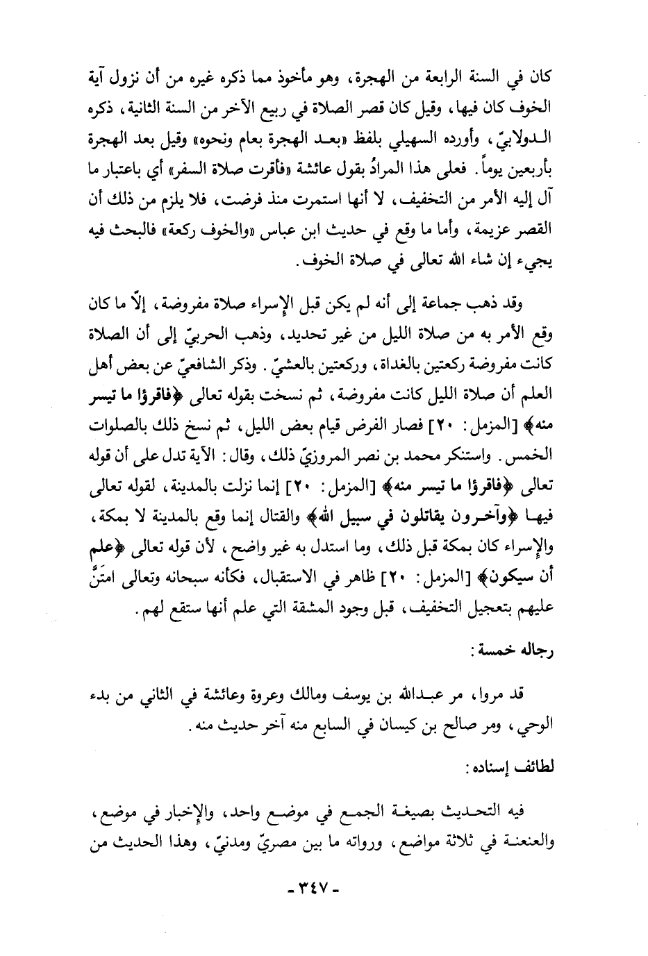 وقد ذهب جماعة إلى أنه لم يكن قبل الإسراء صلاة مفروضة، إلَّا ما كان وقع الأمر به من صلاة الليل من غير تحديد، وذهب الحربيّ إلى أن الصلاة كانت مفروضة ركعتين بالغداة، وركعتين بالعشيّ. وذكر الشافعيّ عن بعض أهل العلم أن صلاة الليل كانت مفروضة، ثم نسخت بقوله تعالى {فَاقْرَءُوا مَا تَيَسَّرَ مِنْهُ} [المزمل: 20] فصار الفرض قيام بعض الليل، ثم نسخ ذلك بالصلوات الخمس. واستنكر محمد بن نصر المروزيّ ذلك، وقال: الآية تدل على أن قوله تعالى {فَاقْرَءُوا مَا تَيَسَّرَ مِنْهُ} [المزمل: 20] إنما نزلت بالمدينة، لقوله تعالى فيها {وَآخَرُونَ يُقَاتِلُونَ فِي سَبِيلِ اللَّهِ} والقتال إنما وقع بالمدينة لا بمكة، والإسراء كان بمكة قبل ذلك، وما استدل به غير واضح؛ لأن قوله تعالى {عَلِمَ أَنْ سَيَكُونُ} [المزمل: 20] ظاهر في الاستقبال، فكأنه سبحانه وتعالى امتَنَّ عليهم بتعجيل التخفيف، قبل وجود المشقة التي علم أنها ستقع لهم.