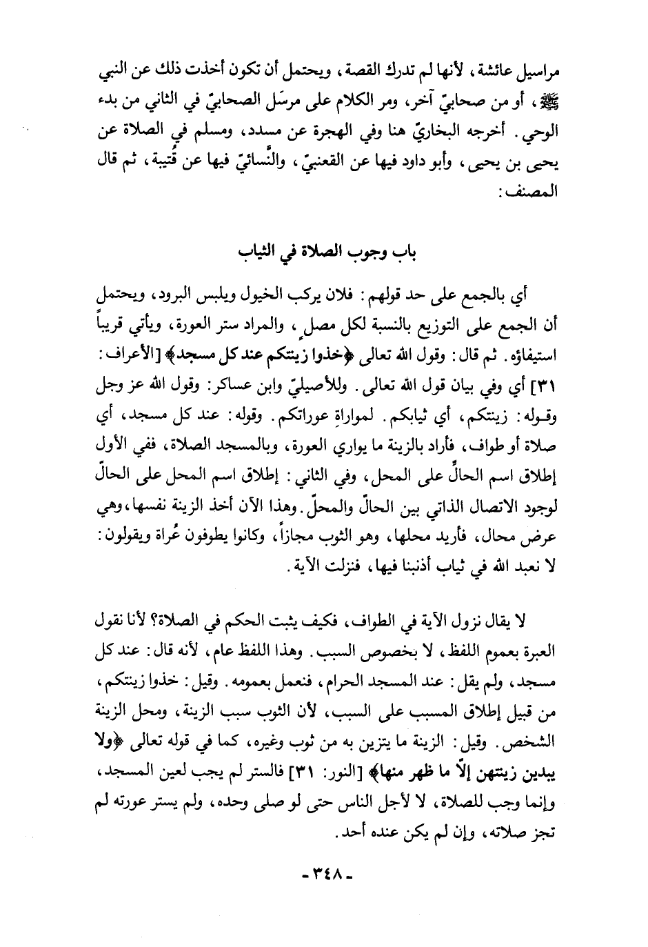 لا يقال نزول الآية في الطواف، فكيف يثبت الحكم في الصلاة؟ لأنا نقول العبرة بعموم اللفظ، لا بخصوص السبب. وهذا اللفظ عام، لأنه قال: عند كل مسجد، ولم يقل: عند المسجد الحرام، فنعمل بعمومه. وقيل: خذوا زينتكم، من قبيل إطلاق المسبب على السبب، لأنّ الثوب سبب الزينة، ومحل الزينة الشخص. وقيل: الزينة ما يتزين به من ثوب وغيره، كما في قوله تعالى {وَلَا يُبْدِينَ زِينَتَهُنَّ إِلَّا مَا ظَهَرَ مِنْهَا} [النور: 31] فالستر لم يجب لعين المسجد، وإنما وجب للصلاة، لا لأجل الناس حتى لو صلى وحده، ولم يستر عورته لم تجز صلاته، وإن لم يكن عنده أحد.