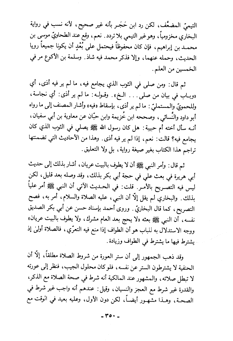 ثم قال: وأمر النبي -صلى الله عليه وسلم- أن لا يطوف بالبيت عريان، أشار بذلك إلى حديث أبي هريرة في بعث علي في حجة أبي بكر بذلك، وقد وصله بعد قليل، لكن ليس فيه التصريح بالأمر. قلت: في الحديث الآتي أن النبي -صلى الله عليه وسلم- أمر عليًا بذلك. والبخاري لم يقل إلَّا أن النبي، عليه الصلاة والسلام، أمر به، فصح التصريح، كما قال البخاريّ. وروى أحمد بإسناد حسن عن أبي بكر الصديق نفسه، أن النبي -صلى الله عليه وسلم- بعثه "لا يحج بعد العام مشرك، ولا يطوف بالبيت عريان" ووجه الاستدلال به للباب هو أن الطواف إذا منع فيه التعرّي، فالصلاة أولى إذ يشترط فيها ما يشترط في الطواف وزيادة.