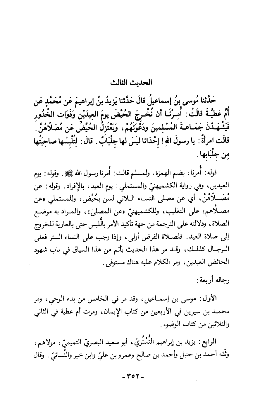 الأول: موسى بن إسماعيل، وقد مرَّ في الخامس من بدء الوحي، ومرَّ محمد بن سيرين في الأربعين من كتاب الإيمان، ومرت أم عطية في الثاني والثلاثين من كتاب الوضوء.