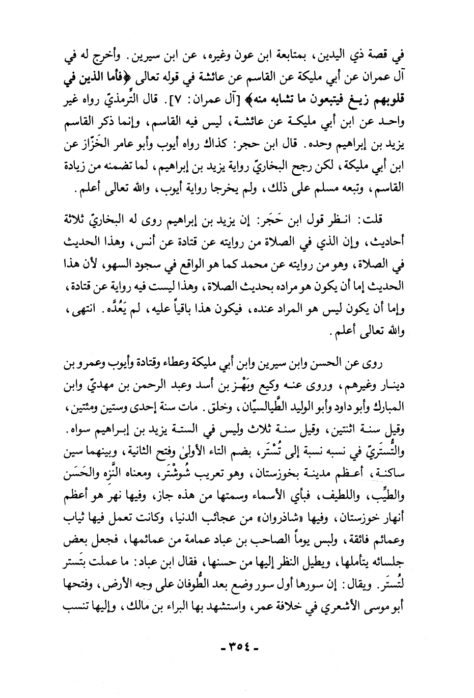 روى عن الحسن وابن سيرين وابن أبي مليكة وعطاء وقتادة وأيوب وعمرو بن دينار وغيرهم، وروى عنه وكيع وبَهْز بن أسد وعبد الرحمن بن مهديّ وابن المبارك وأبو داود وأبو الوليد الطَّيالسيّان، وخلق. مات سنة إحدى وستين ومئتين، وقيل سنة اثنتين، وقيل سنة ثلاث وليس في الستة يزيد بن إبراهيم سواه. والتُّستَريّ في نسبه نسبة إلى تُسْتَر، بضم التاء الأولى وفتح الثانية، وبينهما سين ساكنة، أعظم مدينة بخوزستان، وهو تعريب شُوشْتَر، ومعناه النَّزِه والحَسَن والطيِّب، واللطيف، فبأي الأسماء وسمتها من هذه جاز، وفيها نهر هو أعظم أنهار خوزستان، وفيها "شاذروان" من عجائب الدنيا، وكانت تعمل فيها ثياب وعمائم فائقة، ولبس يومًا الصاحب بن عباد عمامة من عمائمها، فجعل بعض جلسائه يتأملها، ويطيل النظر إليها من حسنها، فقال ابن عباد: ما عملت بتَستر لتُستَر. ويقال: إن سورها أول سور وضع بعد الطُّوفان على وجه الأرض، وفتحها أبو موسى الأشعري في خلافة عمر، واستشهد بها البراء بن مالك، وإليها تنسب