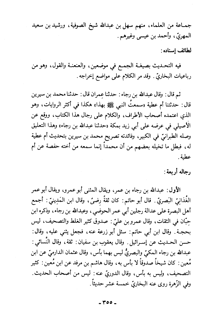 ثم قال: وقال عبد الله بن رجاء: حدثنا عِمران قال: حدثنا محمد بن سيرين قال: حدثتنا أم عطية "سمعت النبي -صلى الله عليه وسلم- بهذا" هكذا في أكثر الروايات، وهو الذي اعتمده أصحاب الأطراف، والكلام على رجال هذا الكتاب، ووقع عن الأصيلي في عرضه على أبي زيد بمكة "حدثنا عبد الله بن رجاء" وهذا التعليق وصله الطبرانيّ في الكبير، وفائدته تصريح محمد بن سيرين بتحديث أم عطية له، فبطل ما تخيله بعضهم من أن محمدًا إنما سمعه من أخته حفصة عن أم عطية.