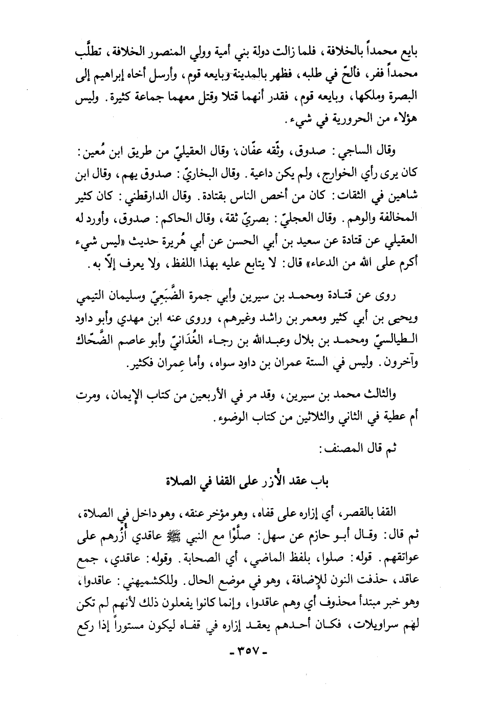 القفا بالقصر، أي إزاره على قفاه، وهو مؤخر عنقه، وهو داخل في الصلاة، ثم قال: وقال أبو حازم عن سهل: صلَوْا مع النبي -صلى الله عليه وسلم- عاقدي أُزُرهم على عواتقهم. قوله: صلوا، بلفظ الماضي، أي الصحابة. وقوله: عاقدي، جمع عاقد، حذفت النون للإضافة، وهو في موضع الحال. وللكشميهني: عاقدوا، وهو خبر مبتدأ محذوف أي وهم عاقدوا، وإنما كانوا يفعلون ذلك لأنهم لم تكن لهم سراويلات، فكان أحدهم يعقد إزاره في قفاه ليكون مستورًا إذا ركع