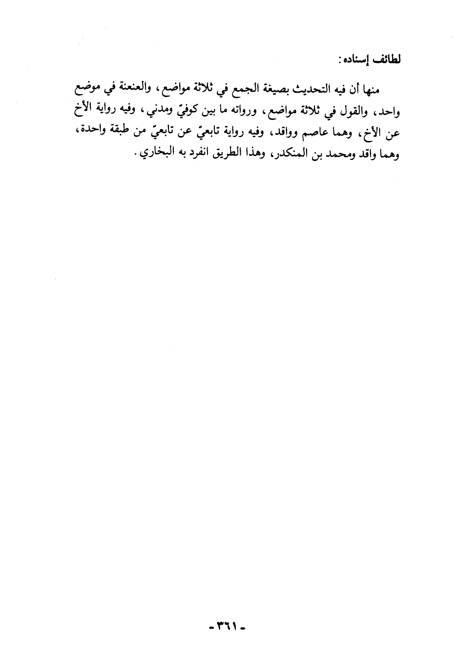 منها أن فيه التحديث بصيغة الجمع في ثلاثة مواضع، والعنعنة في موضع واحد، والقول في ثلاثة مواضع، ورواته ما بين كوفى ومدني، وفيه رواية الأخ عن الأخ، وهما عاصم وواقد، وفيه رواية تابعى عن تابعى من طبقة واحدة، وهما واقد ومحمد بن المنكدر، وهذا الطريق انفرد به البخاري.