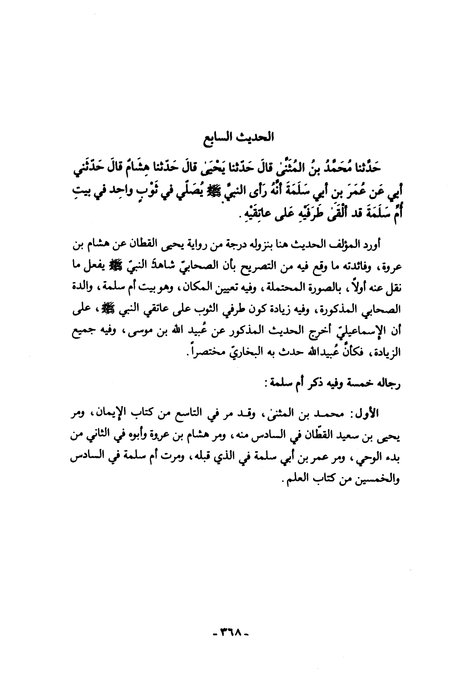 الأول: محمد بن المثنى، وقد مرَّ في التاسع من كتاب الإيمان، ومرَّ يحيى بن سعيد القطّان في السادس منه، ومرَّ هشام بن عروة وأبوه في الثاني من بدء الوحي، ومرَّ عمر بن أبي سلمة في الذي قبله، ومرت أم سلمة في السادس والخمسين من كتاب العلم.