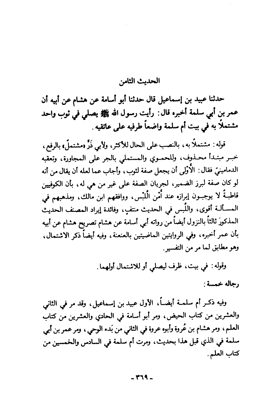 حَدَّثَنَا عُبَيْدُ بْنُ إِسْمَاعِيلَ قَالَ حَدَّثَنَا أَبُو أُسَامَةَ عَنْ هِشَامٍ عَنْ أَبِيهِ أَنَّ عُمَرَ بْنَ أَبِي سَلَمَةَ أَخْبَرَهُ قَالَ: رَأَيْتُ رَسُولَ اللَّهِ -صلى الله عليه وسلم- يُصَلِّي فِي ثَوْبٍ وَاحِدٍ مُشْتَمِلاً بِهِ فِي بَيْتِ أُمِّ سَلَمَةَ، وَاضِعًا طَرَفَيْهِ عَلَى عَاتِقَيْهِ.